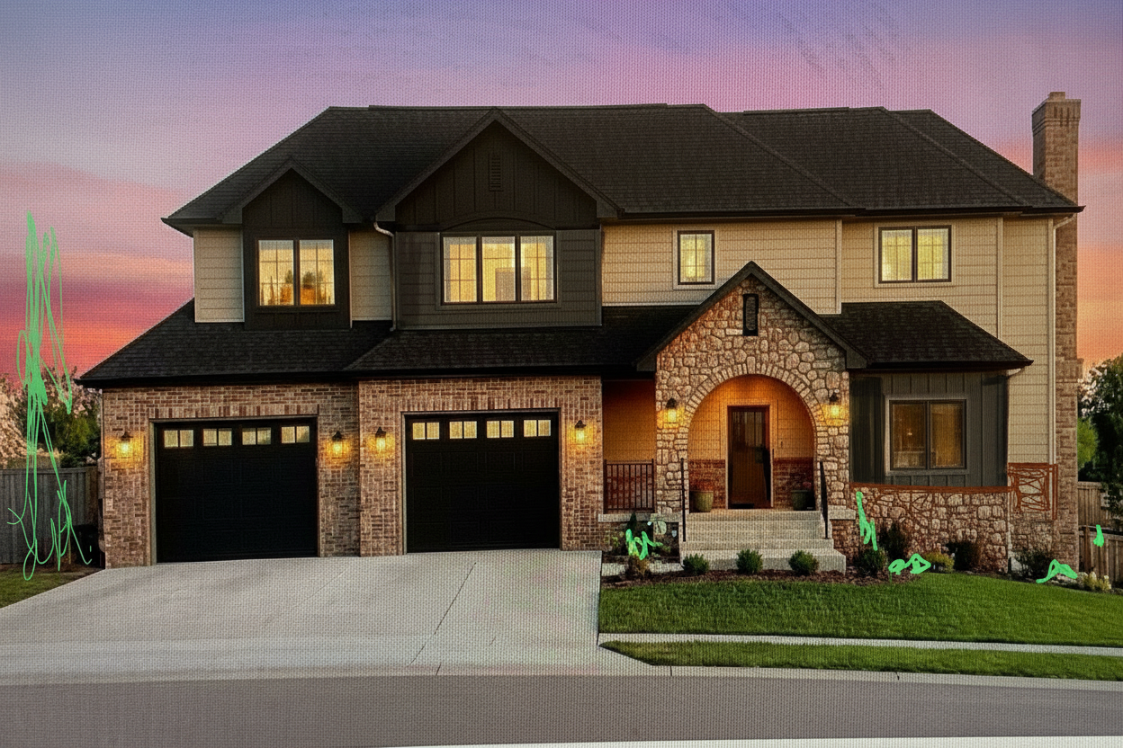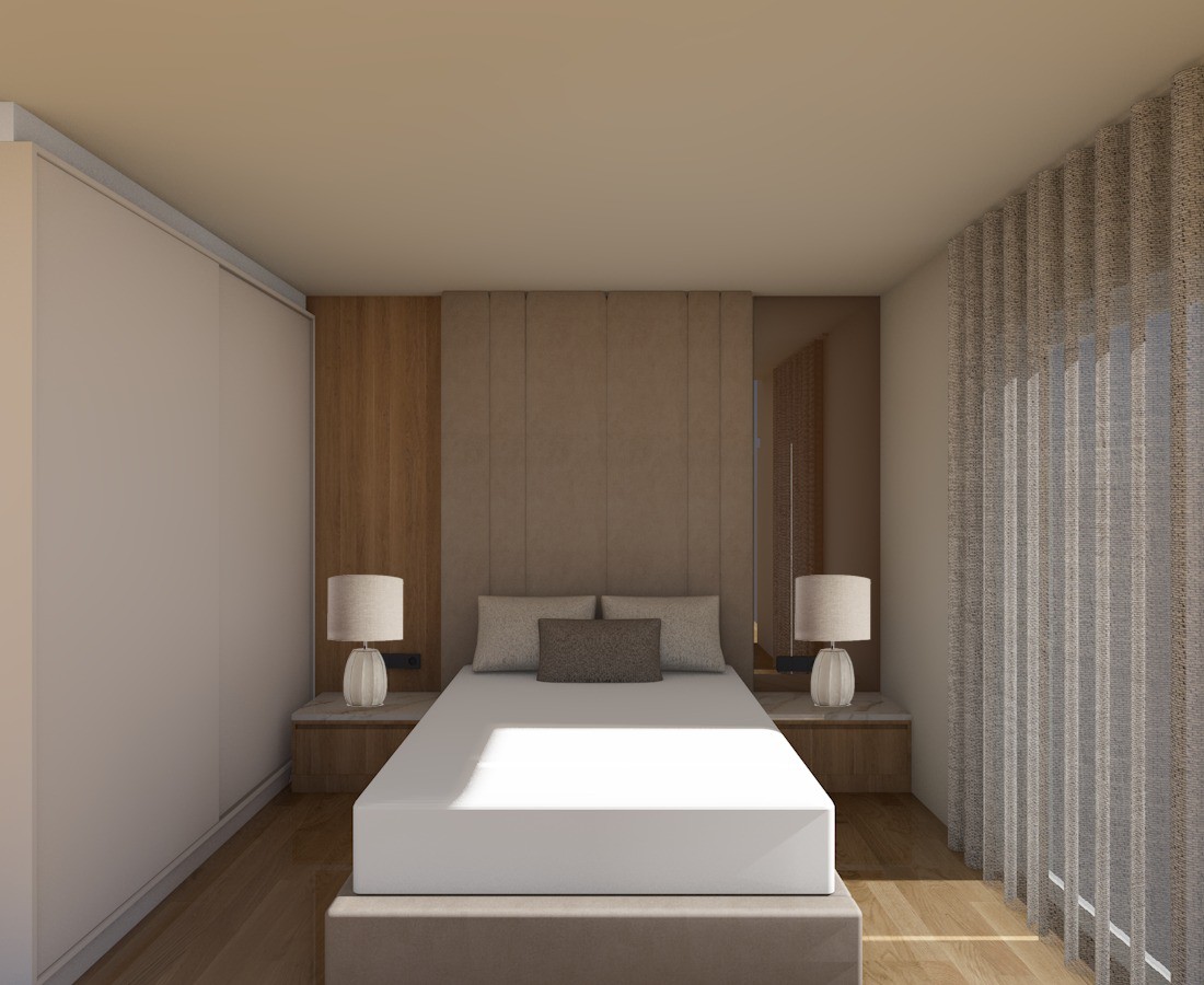 this is a contemporary bedroom that exudes warmth and feels luxurious and expensive the headboard is upholstered in premium linen beige sand fabric and extends all the way to the ceiling creating a strong vertical statement and an elegant focal point on the right side of the elevation there is a full height bronze mirror in the left there is a light champagne oak wood panel adding warmth and contrast the bed is dressed with perfectly ironed impeccably arranged bedding and pillows styled like a five star hotel the sheets and duvet are crisp smooth and wrinkle free two back pillows are in an off white beige tone while the front decorative pillow features a darker beige taupe fabric adding depth and layering the bedside tables are finished in champagne oak tone matching the wood paneling the top surface is white marble with subtle natural beige veining on top of each bedside table there are two table lamps as shown in the photo the lampshade features a beige linen fabric on the right the curtains are off white keep exactly the same shape as the photo they have a defined elegant shape and allow natural light to filter beautifully into the space the overall atmosphere is refined warm contemporary luxury with balanced natural light and soft ambient lighting