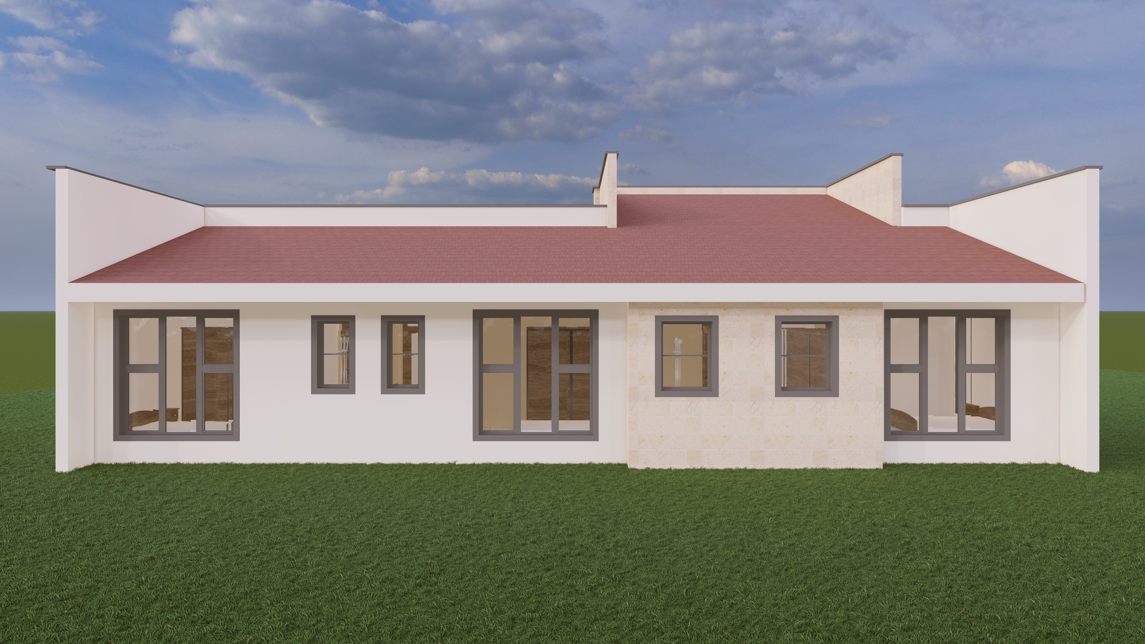 add trees and vegetation and a hedge in the background to give image context make the surfaces that are stone texture more textured such that the contrast with the crisp white surfaces is clear