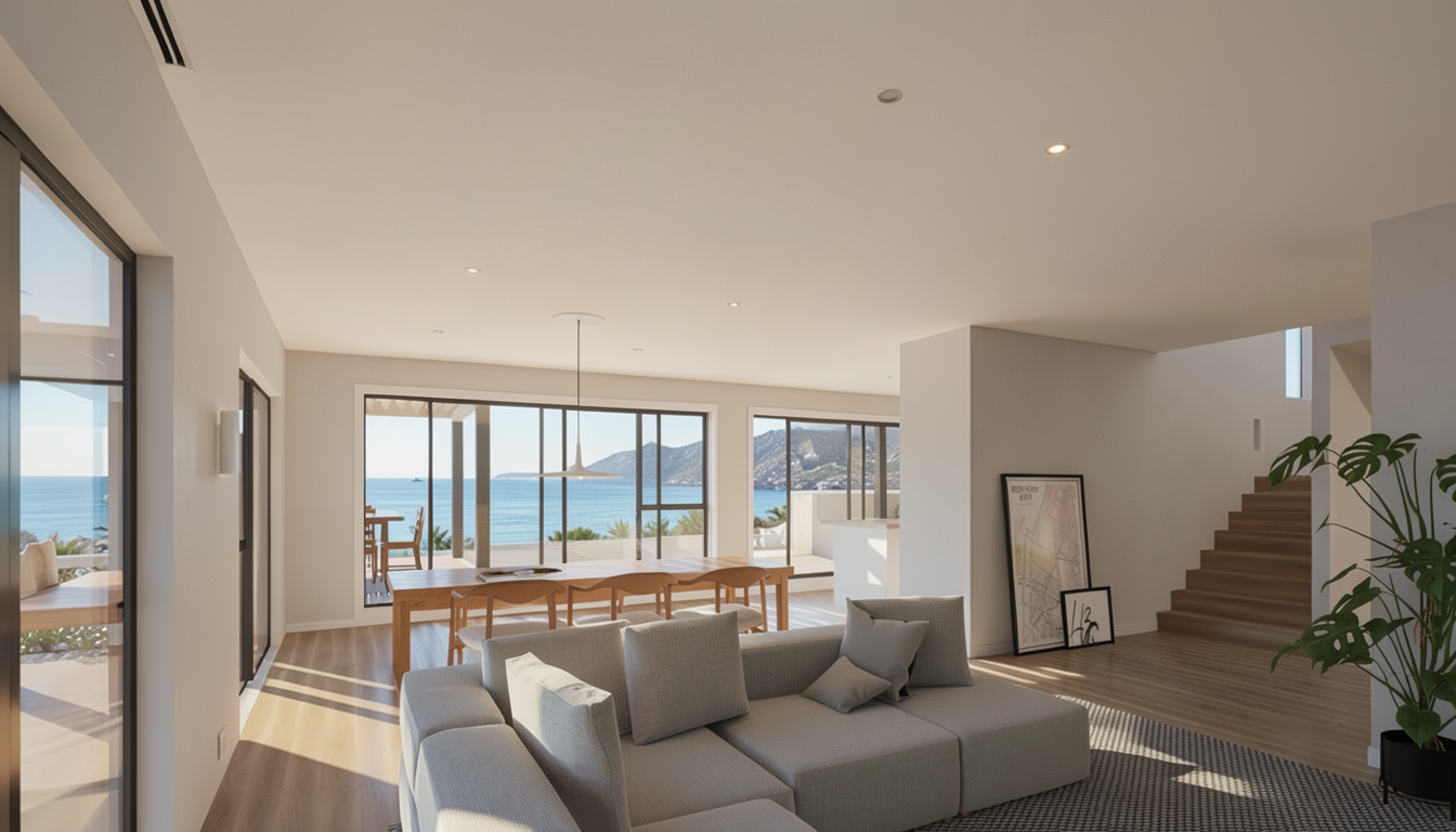 white limestone pool deck low 2 foot short hedge behind pool lush evergreen landscaping on right side of image
