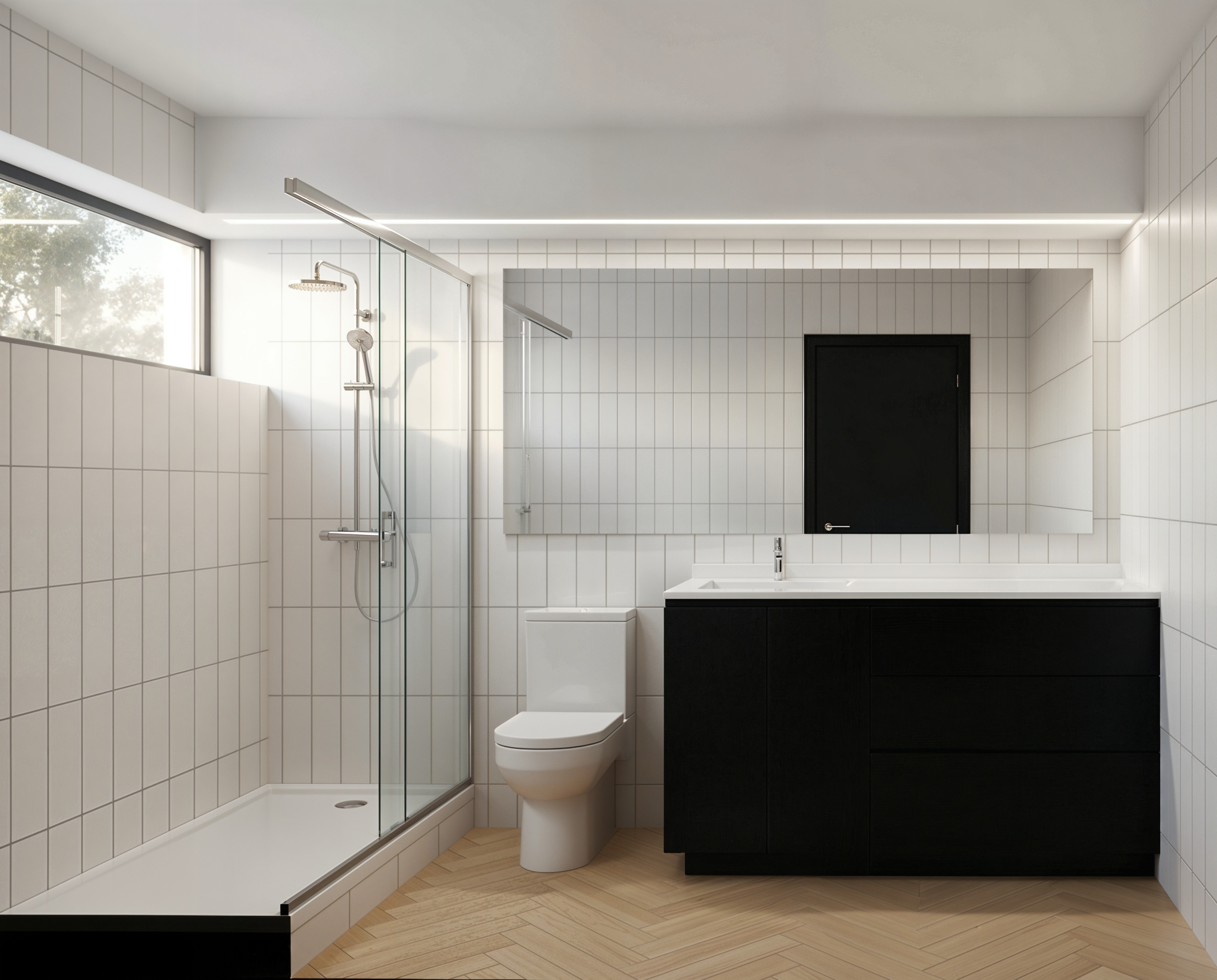 install a compact black electric towel warmer on the right hand wall positioned above the vanity clean and minimal integrated into the overall architectural composition