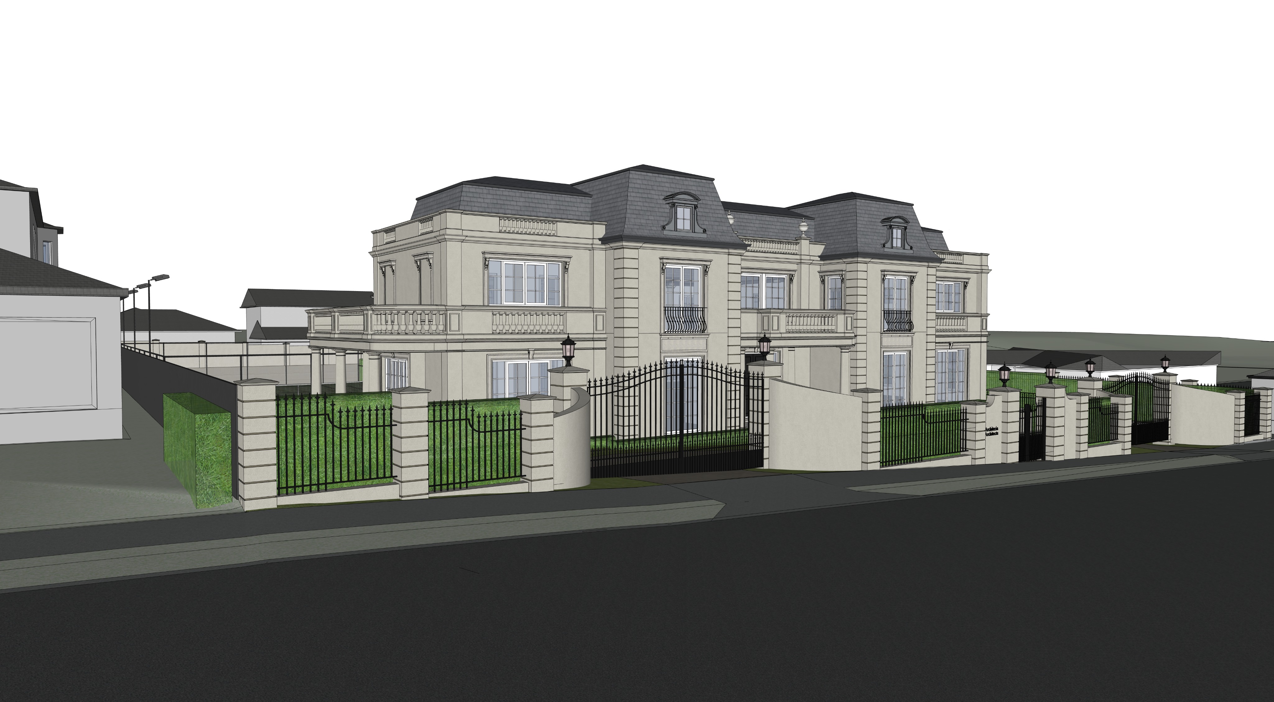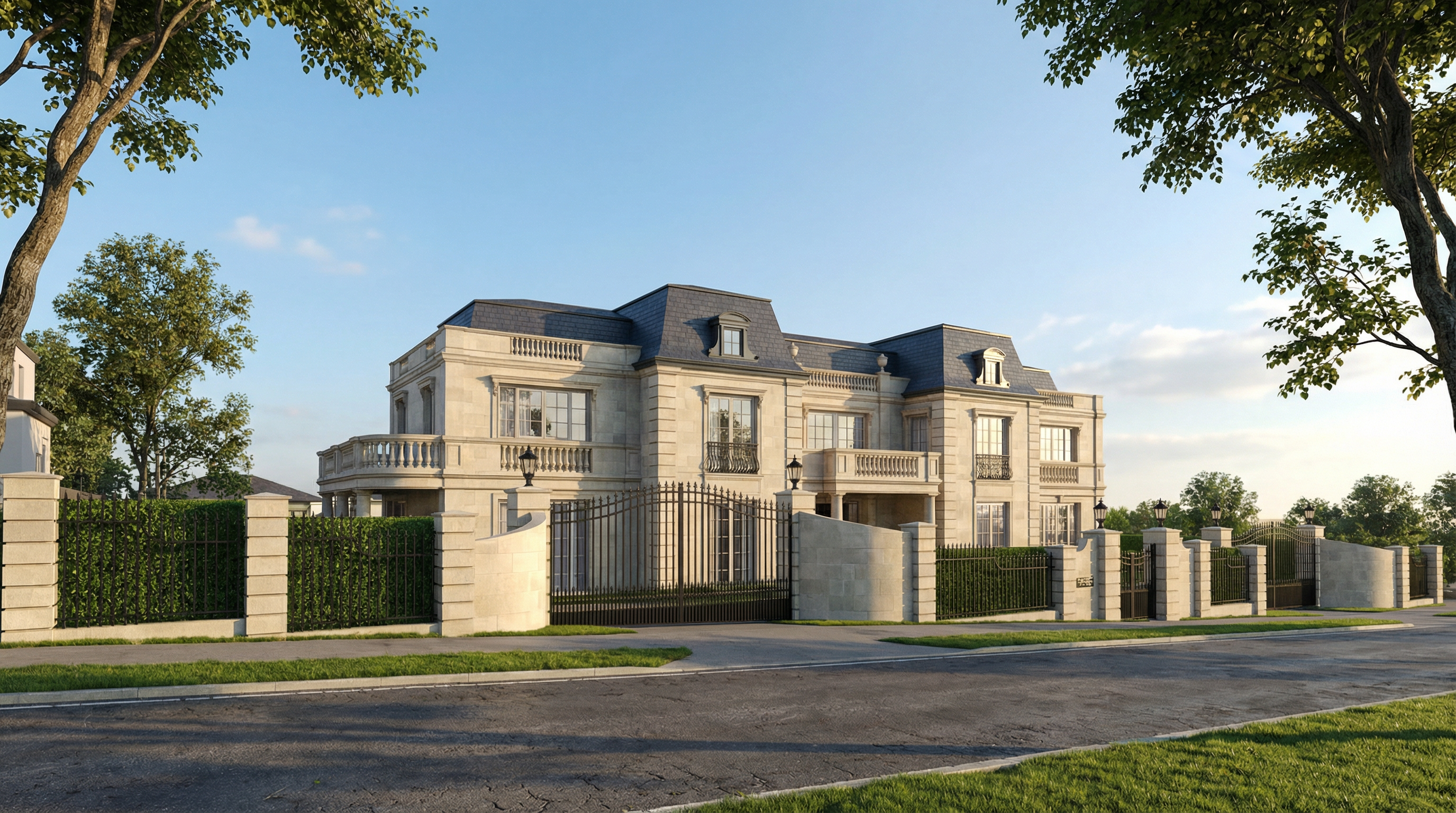 photorealistic render canon eos 5d classical home high green hedges fence dramatic lighting award winning at dusk slate roofing wet road pedestrian gate with two vehiecular gates on the side diffused light on the curated objects within which reflect a blend of natural textures the composition should be balanced and serene evoking a sense of high end artistry with subtle reflections of the internal light the overall image should be sharp exquisite detail from the texture of the building materials to the softness of the light glow