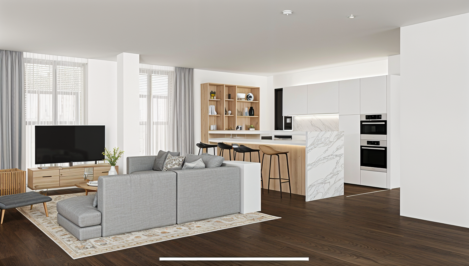 improve the quality of the attached image with more realism without changing any of the room elements furniture walls or floors just give the image realism using corona technology