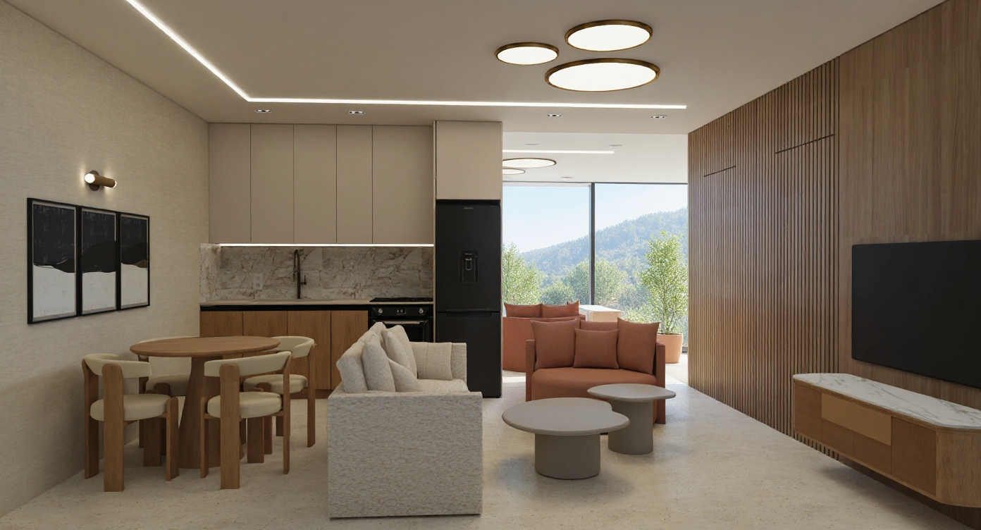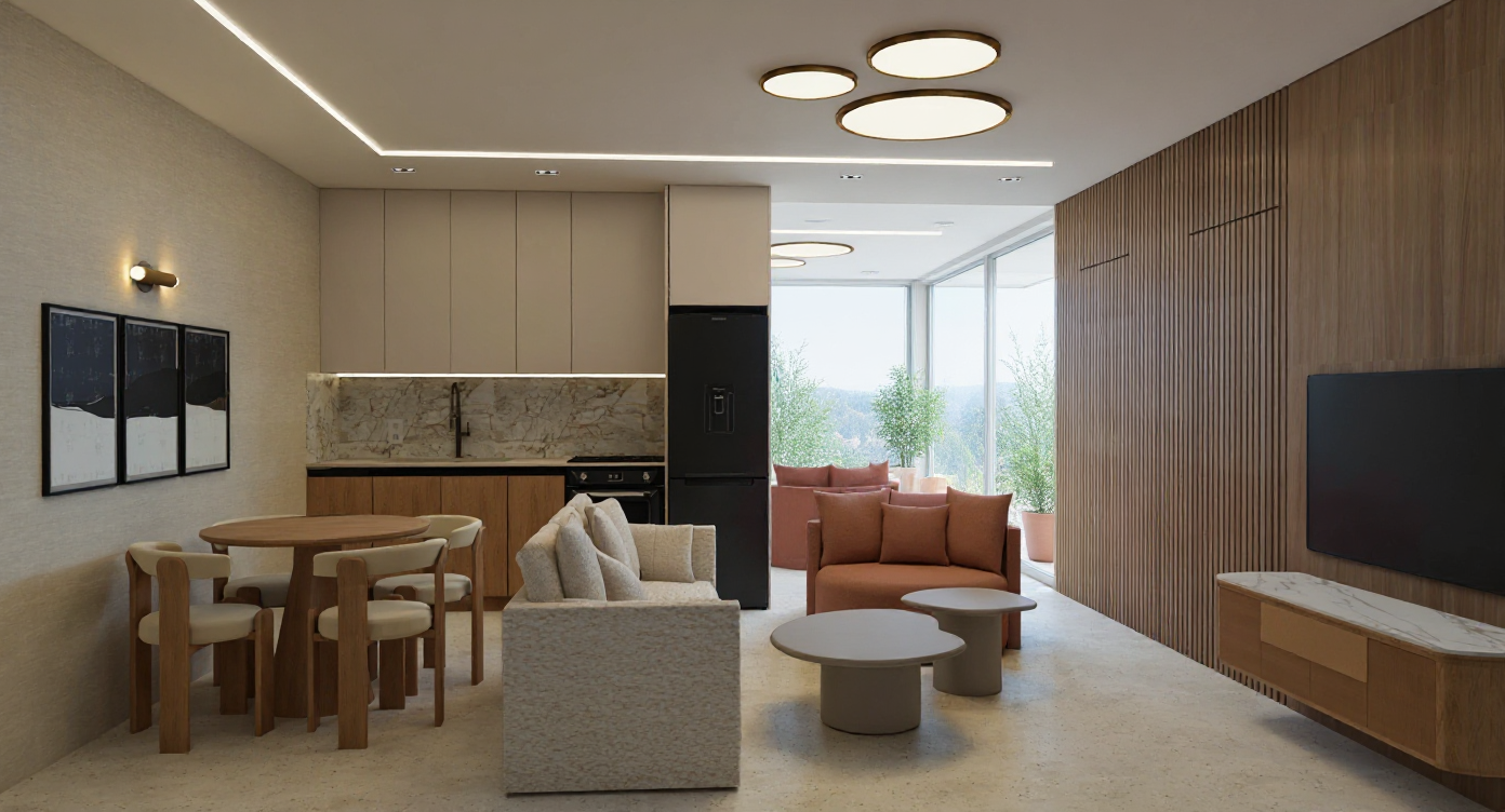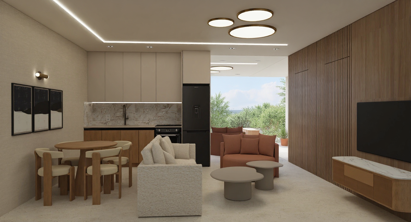 reate a high definition photorealistic 3d render do not change the materials insert artificial light with a temperature of 3000k also illuminate the room in the far background the materials text and furnishings must remain exactly in the same position and with the same proportions but must appear more realistic insert a couple of people talking in the background