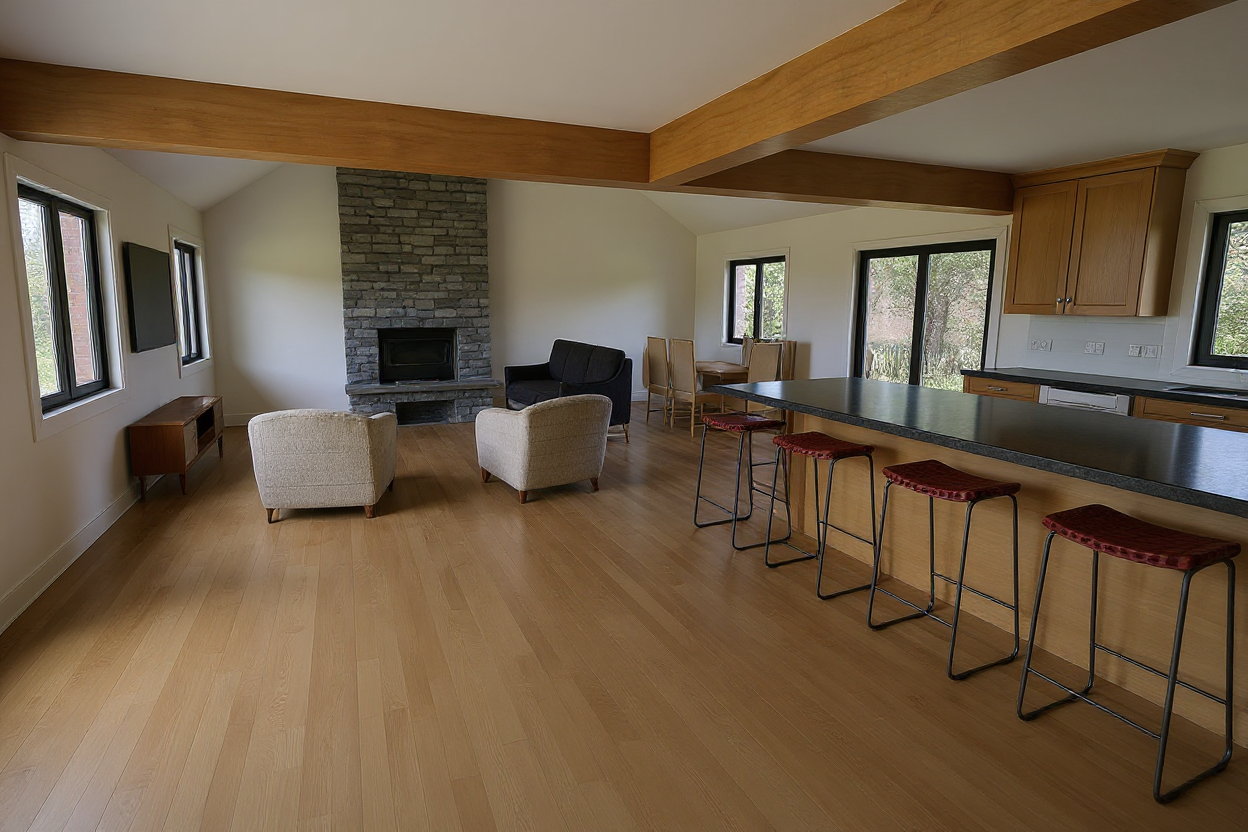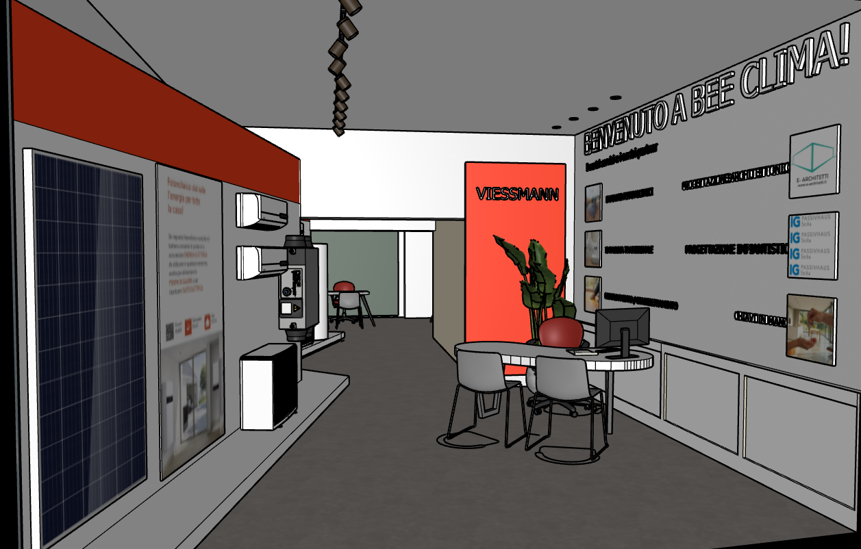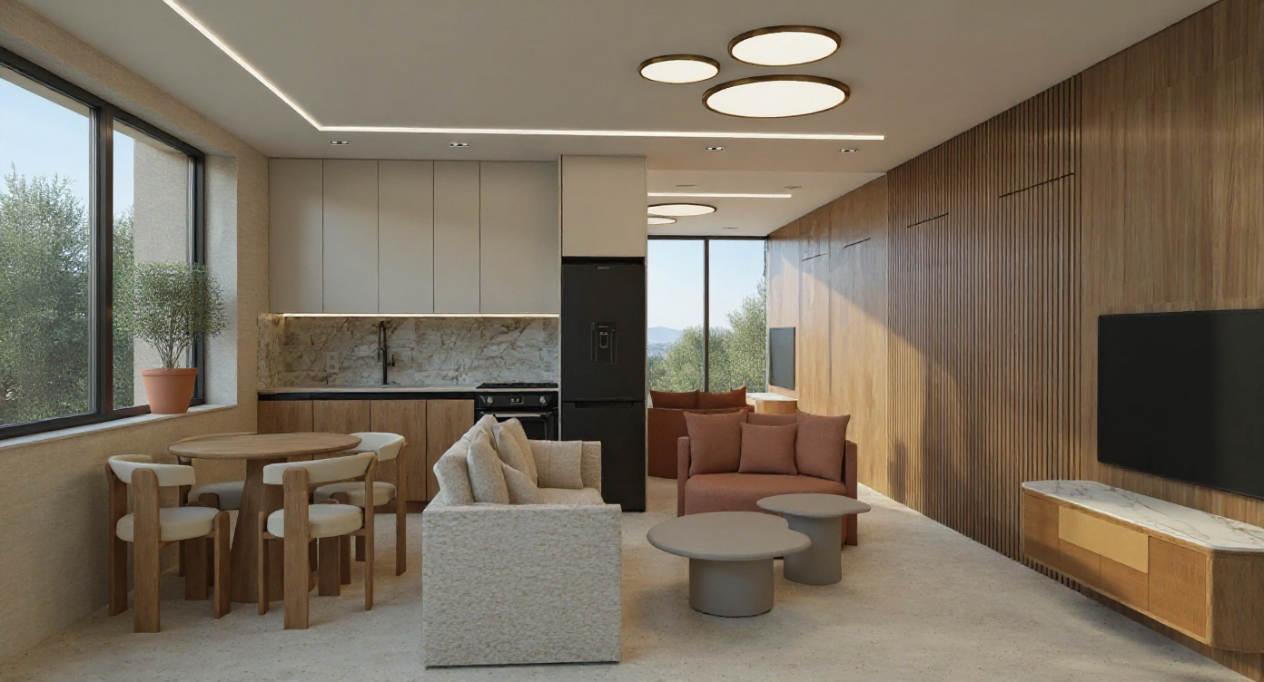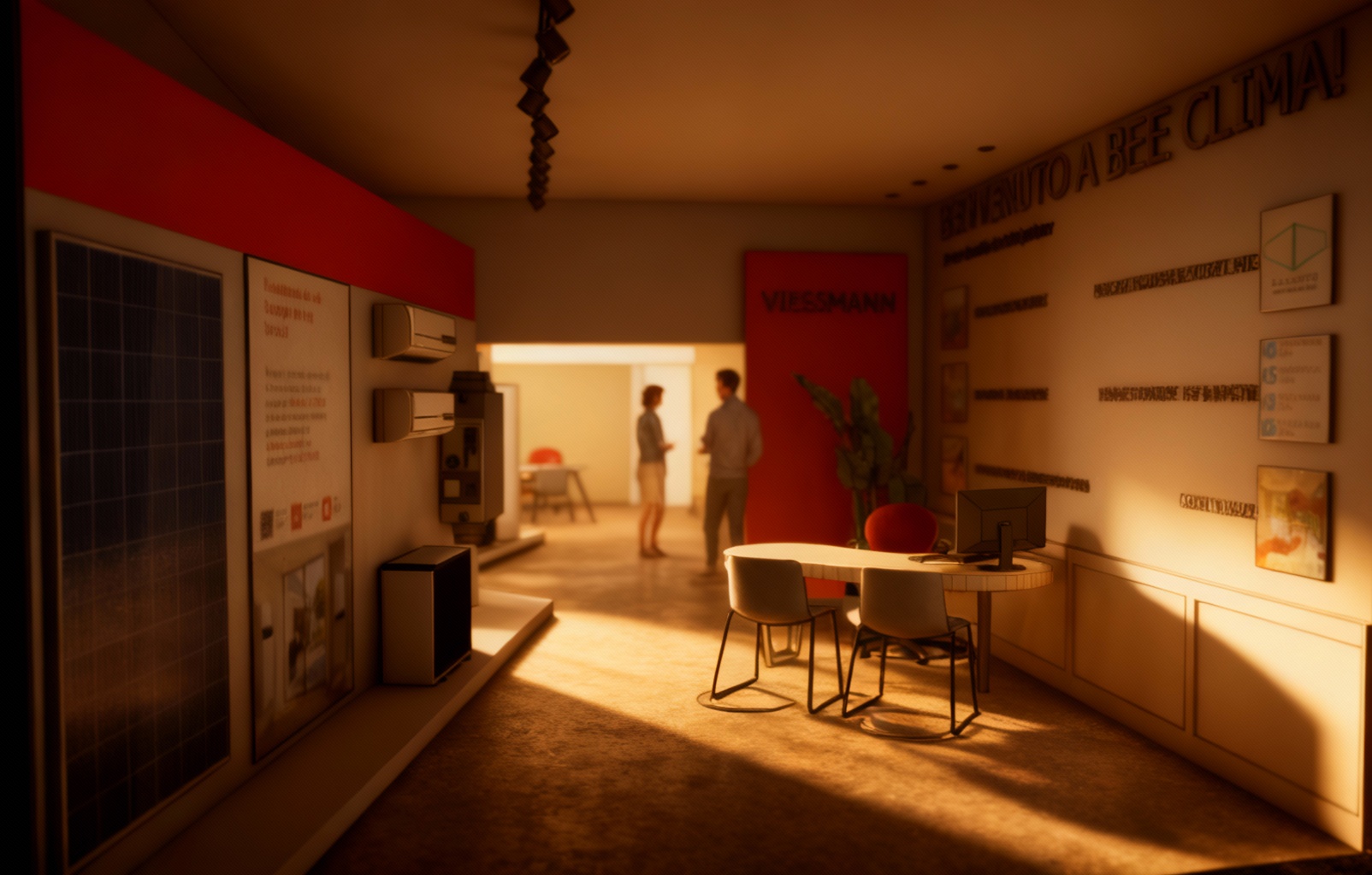 reate a high definition photorealistic 3d render do not change the materials insert artificial light with a temperature of 3000k also illuminate the room in the far background the materials text and furnishings must remain exactly in the same position and with the same proportions but must appear more realistic insert a couple of people talking in the background