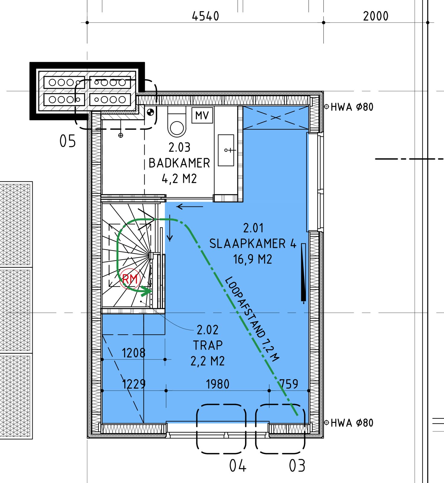 convert this floor plan into a realistic isometric 3d view of a full house show the space from an elevated angle with furniture walls and details visible graag de indeling houden zoals in de afbeelding geen muren verplaatsen aub ook geen ruimtes bij maken exact de plattegrond gebruiken zoals aangeleverd en ook de ramen zetten waar ze in de afbeelding staan ook de trap graag houden waar hij staat en er geen trap bij maken gewoon 1 trap dus alle maten en teksten mogen eruit de grote ruimte mag je inrichten als een slaapkamer en de kleine ruimte mag je inrichten als een badkamer met douche dubbele wastafel en toilet graag in de slaapkamer een pvc vloer in licht eiken met greywash in de badkamer een lichtgrijze grote tegel op de vloer en de wanden maar op de achterwand lange donkerblauwe kleine tegels van 16 x 4 cm use the same furniture as shows on the plan do not change the orientation of the floorplan