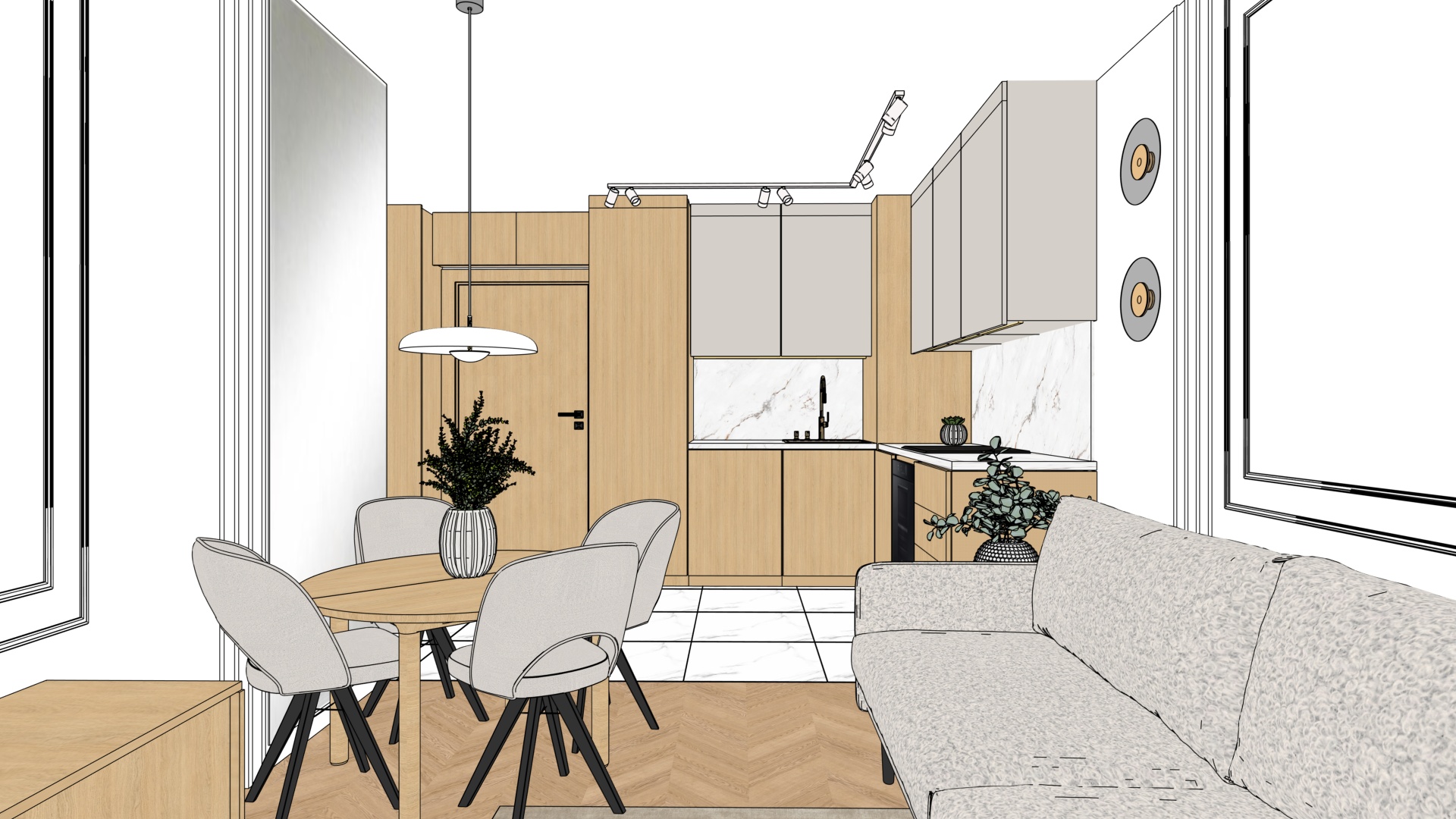 fotorealistyczna fotografia wn trza klasy premium projekt uk ad meble i materia y bez adnych zmian wzgl dem obrazu wej ciowego naturalne wiat o dzienne perfekcyjna ekspozycja naturalny balans bieli bardzo realistyczne materia y i detali zero zmian zero okien lampa szynowa w kuchni jest bia a lampa nad sto em okr g ym ma kolor bia y ciana po prawej stronie jest ca a bia a z podw jna sztukateri po lewej stronie na cianie za sto em wida du e lustro na zdj ciu wej ciowym zaznaczone szar tafl krzes a lekko szare bez oblam wki