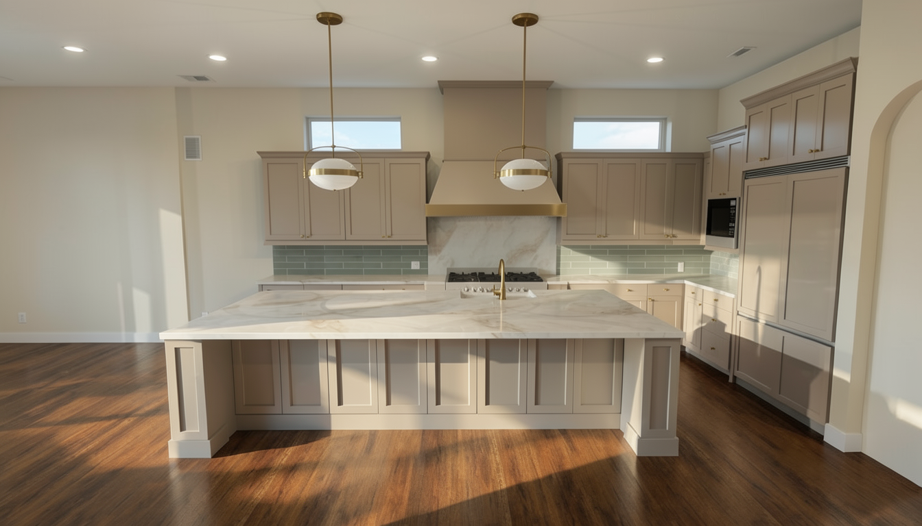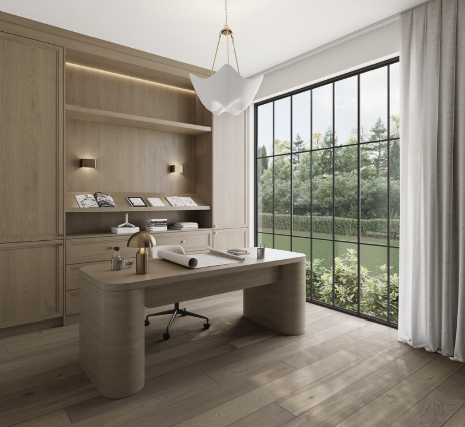 millwork adjustment center section projection revise only the center base cabinet drawer section of the back wall millwork as follows geometry adjustment increase the depth of the entire center cabinet section by 4 inches projecting it forward from the plane of the adjacent tall cabinets the projection should apply to the full vertical extent of the center section base drawers open shelving upper panel reading as one continuous element alignment integration maintain perfect horizontal and vertical alignment with all existing millwork elements shelf lines must remain continuous and flush in elevation upper and side panel relationships must remain unchanged ensure clean intentional transitions where the bumped out section meets the flanking cabinetry no visible breaks in design logic design consistency match exactly wood tone grain direction and finish panel detailing reveals and edge profiles integrated led strip lighting and sconce placement shelf styling and accessory layout proportions do not alter desk design position or materiality flooring tone plank pattern or finish window system mullions exterior view or daylighting curtains and all soft elements camera angle perspective shadows or reflections design intent the center section should read as a subtle architectural projection a refined depth shift that introduces hierarchy and shadow without drawing attention to itself the effect should feel integrated and intentional not applied or decorative