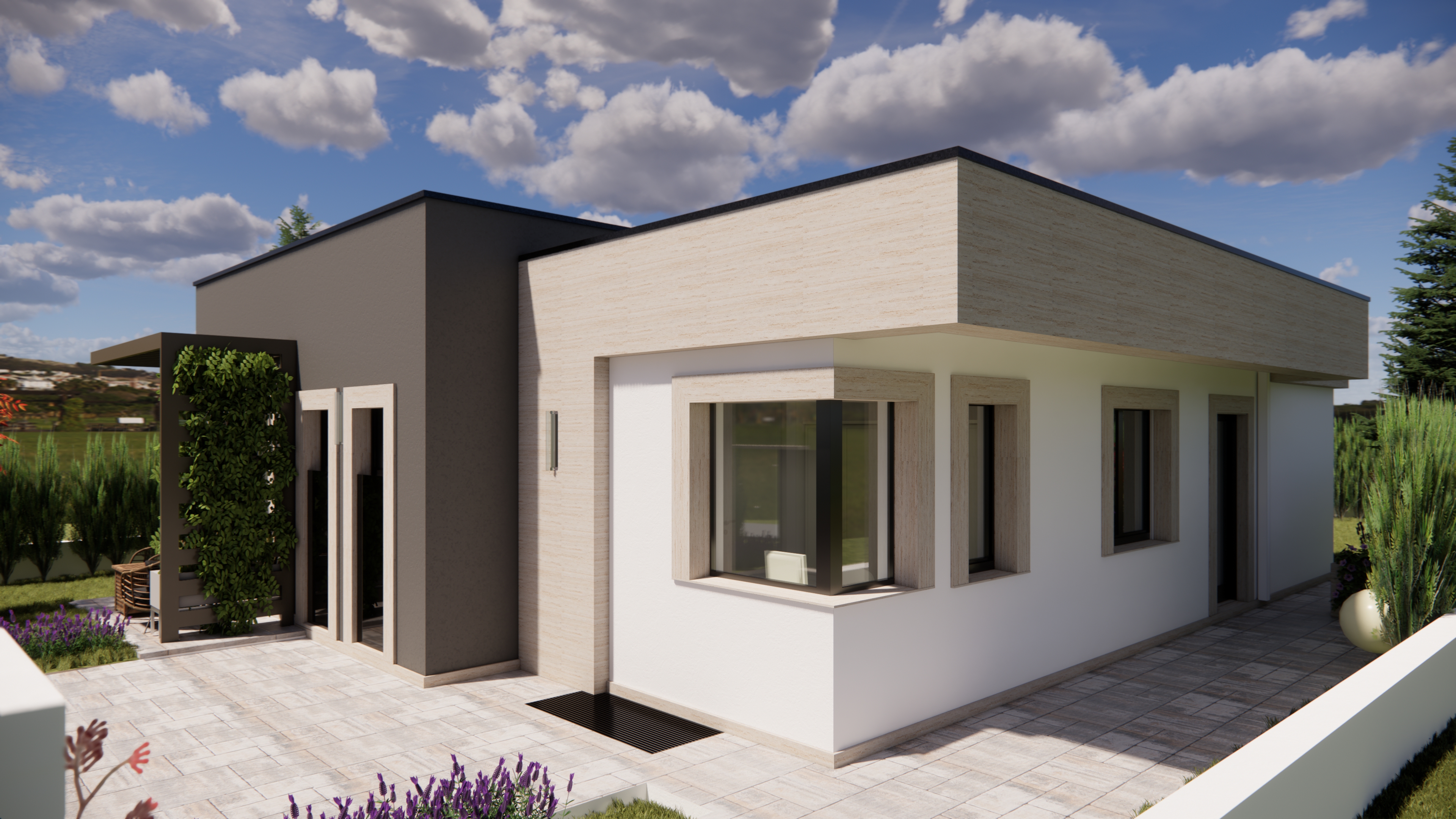 modern architectural structure with white facade and black window accents multi story design bright blue sky with fluffy white clouds lush vibrant green grass on the hillside tall leafy green trees with intricate branches on the left clear sunny atmosphere casting soft shadows evoking a crisp fresh morning ambiance