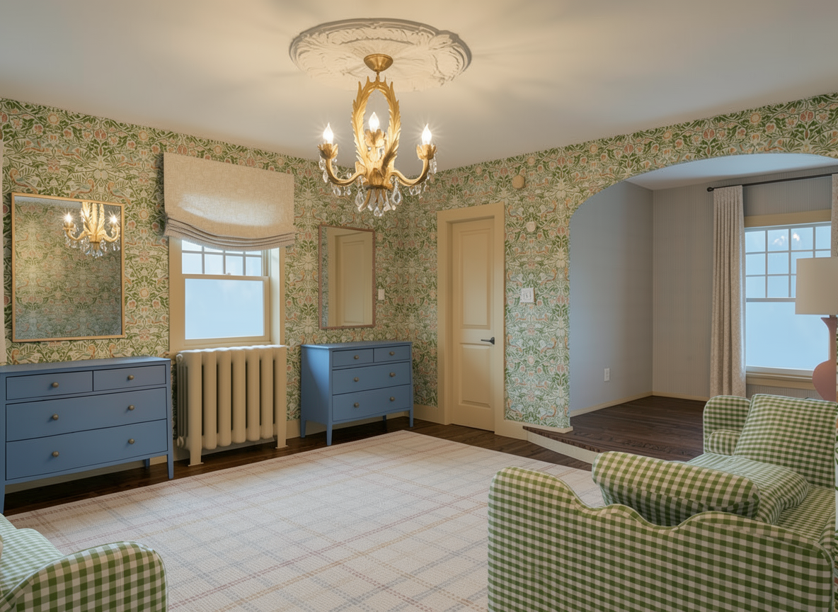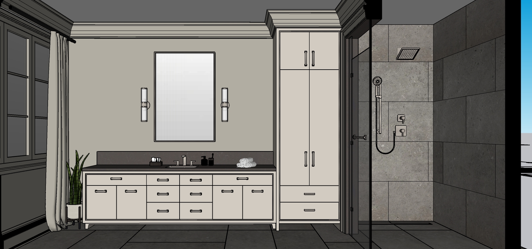 prompt ensuite render project type photorealistic interior bathroom rendering reference use the provided bathroom image as a strict reference replicate the exact layout proportions architectural details and design intent design consistency maintain the same plumbing fixtures lighting fixtures moldings floor pattern colors and decorative details as the reference no changes to geometry dimensions or fixture placement floor gray stone porcelain tile with a natural finish the floor pattern must exactly match the reference image shower walls gray stone porcelain tile matching the floor all other walls smooth painted drywall in the same color as the reference image casing trim and crown molding painted in the same tone and finish as the walls millwork cabinetry and drawers as per reference proportions color and design 19 mm brushed nickel trim surrounding the drawers exterior not individually hardware plumbing fixtures brushed nickel finish shower walls white travertine porcelain matching the floor all other walls smooth painted drywall same color as the reference casing trim and crown molding painted in the same tone and finish as the walls hardware plumbing fixtures brushed nickel finish lighting all lighting fixtures must be turned on match the reference image placement color temperature and intensity soft realistic interior illumination with accurate shadows and reflections windows treatments windows must include curtain with rod window size placement and blind positioning must follow the reference image exactly accessories styling bathroom accessories must be placed on top of the sink counter following the reference layout vanity sink should have a countertop that follows the same color as the reference mirror the mirror must follow the reference image exactly rectangular mirror with brushed nickel frame the reflection should show only the wall surface with no reflection of other architectural elements fixtures or furnishings accessories include vase with flowers kleenex box toothbrush and holder soap dispenser clean towels accessories should be realistically scaled and naturally arranged not decorative reinterpretations rendering style quality ultra photorealistic materials and textures accurate scale and proportions realistic shadows reflections and ambient occlusion professional interior photography style high resolution render