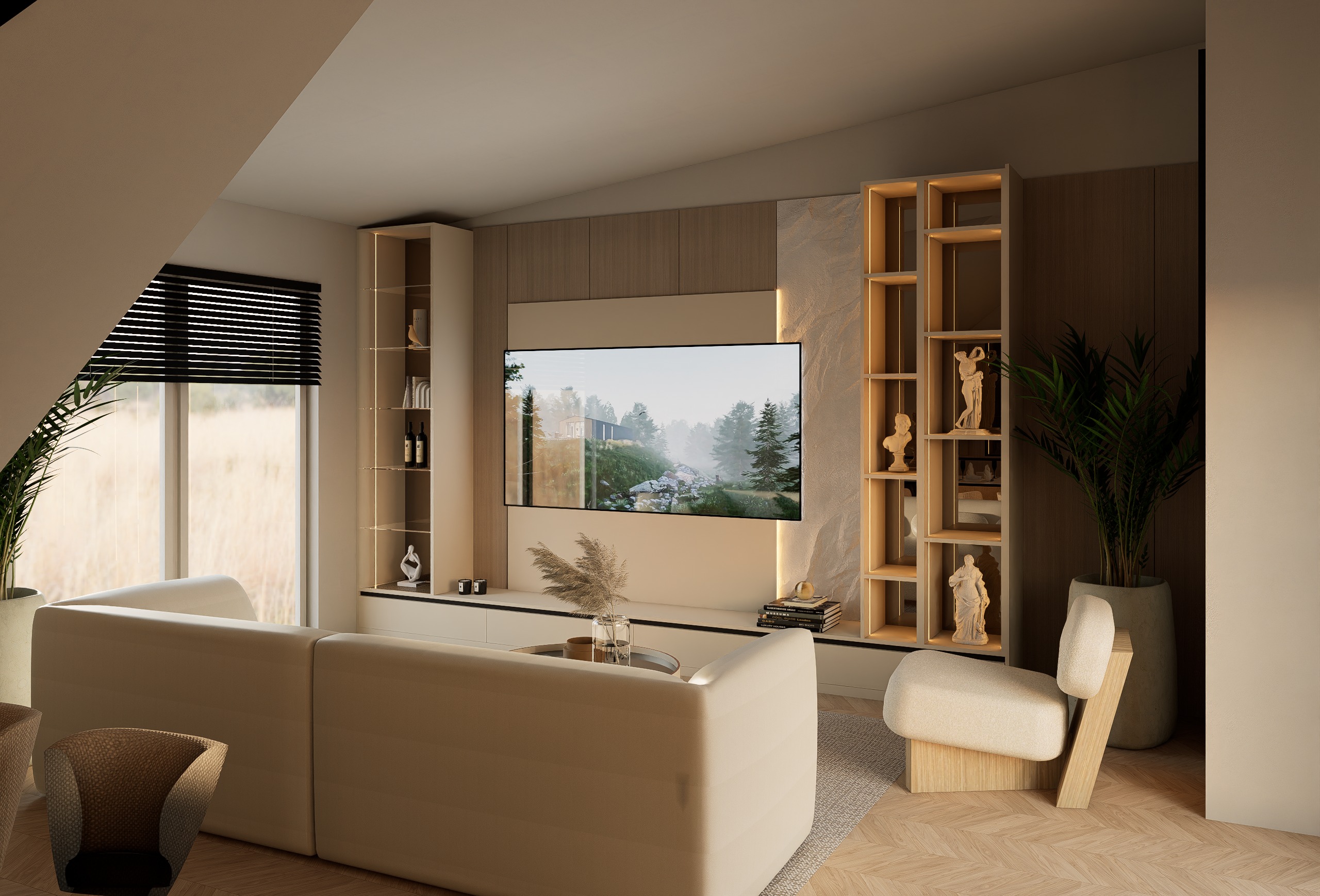ultra realistic interior render of a modern luxury living room maintain exact architecture layout and camera angle from input image materials finishes main wall vertical walnut wood panels dark warm tone matte satin finish rich natural grain seamless texture central tv backdrop soft beige panel with integrated warm led backlighting 3000k diffused glow right feature wall light textured stone slab subtle veins natural matte finish built in shelves same walnut wood exterior interior softly lit with warm led strips 3000k clean minimal joints lower cabinets matte off white cream finish handleless smooth surface furniture sofa soft curved form upholstered in warm beige fabric smooth texture no seams or buttons armchair sculptural modern shape light beige fabric with light wood base coffee table minimal round table neutral tones with subtle decor glass vase with dry branches decor styling keep minimal high end styling sculptures in shelves classical white stone statues add a few books stacked horizontally one tall indoor plant in neutral pot right side lighting warm ambient lighting 3000k soft natural daylight coming from left window balanced exposure no overblown highlights cinematic soft shadows floor light natural wood herringbone parquet matte finish window black horizontal blinds partially open soft daylight entering rendering style photorealistic ultra high detail soft global illumination realistic reflections and shadows no change in geometry proportions or perspective camera keep original camera position and framing exactly eye level interior shot slight wide angle