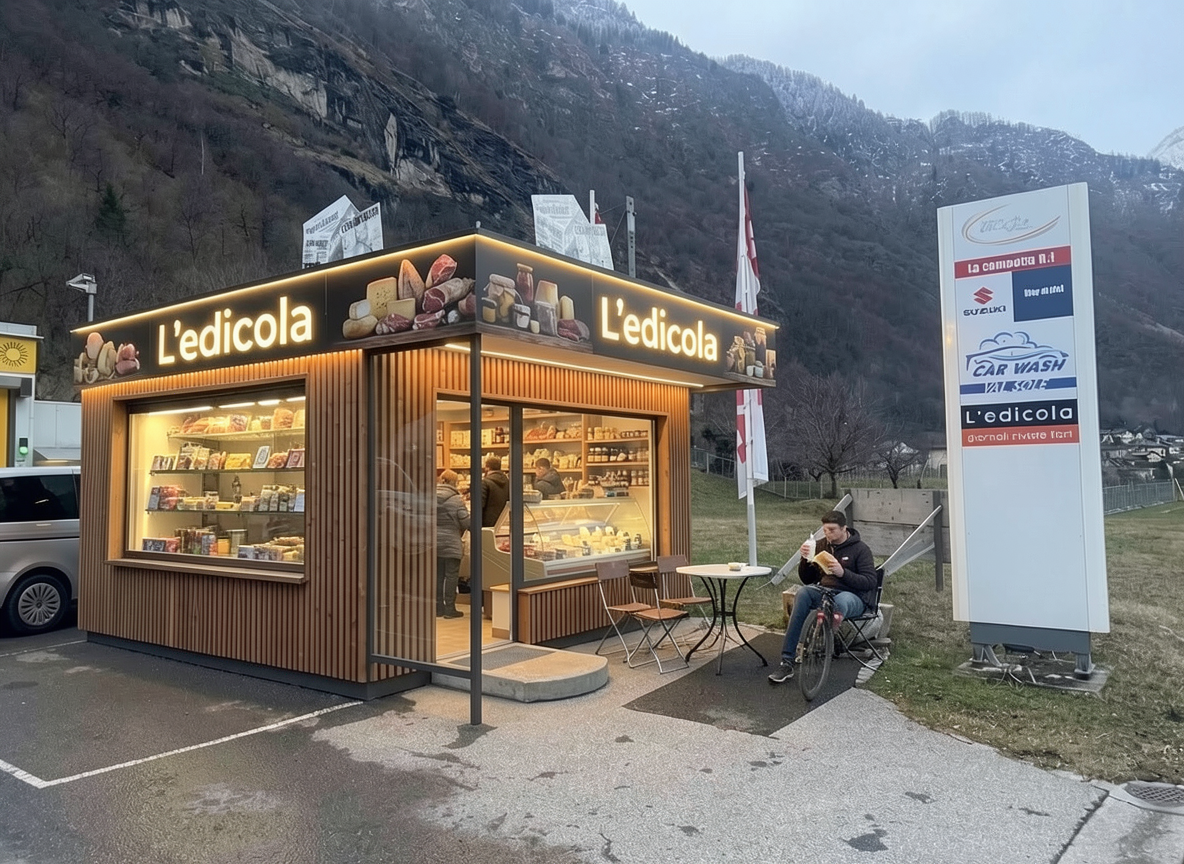 replace the text l edicola with l edicola dei sapori with the writing aligned and continuous also put the writing on the front advertising panel and illuminate it with a floor lamp