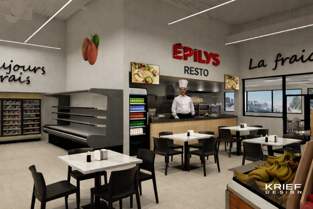 add people sitting at tables eating food add fruits and vegetables into the refrigerator and 1 person in front of it with a red caddy and some food init