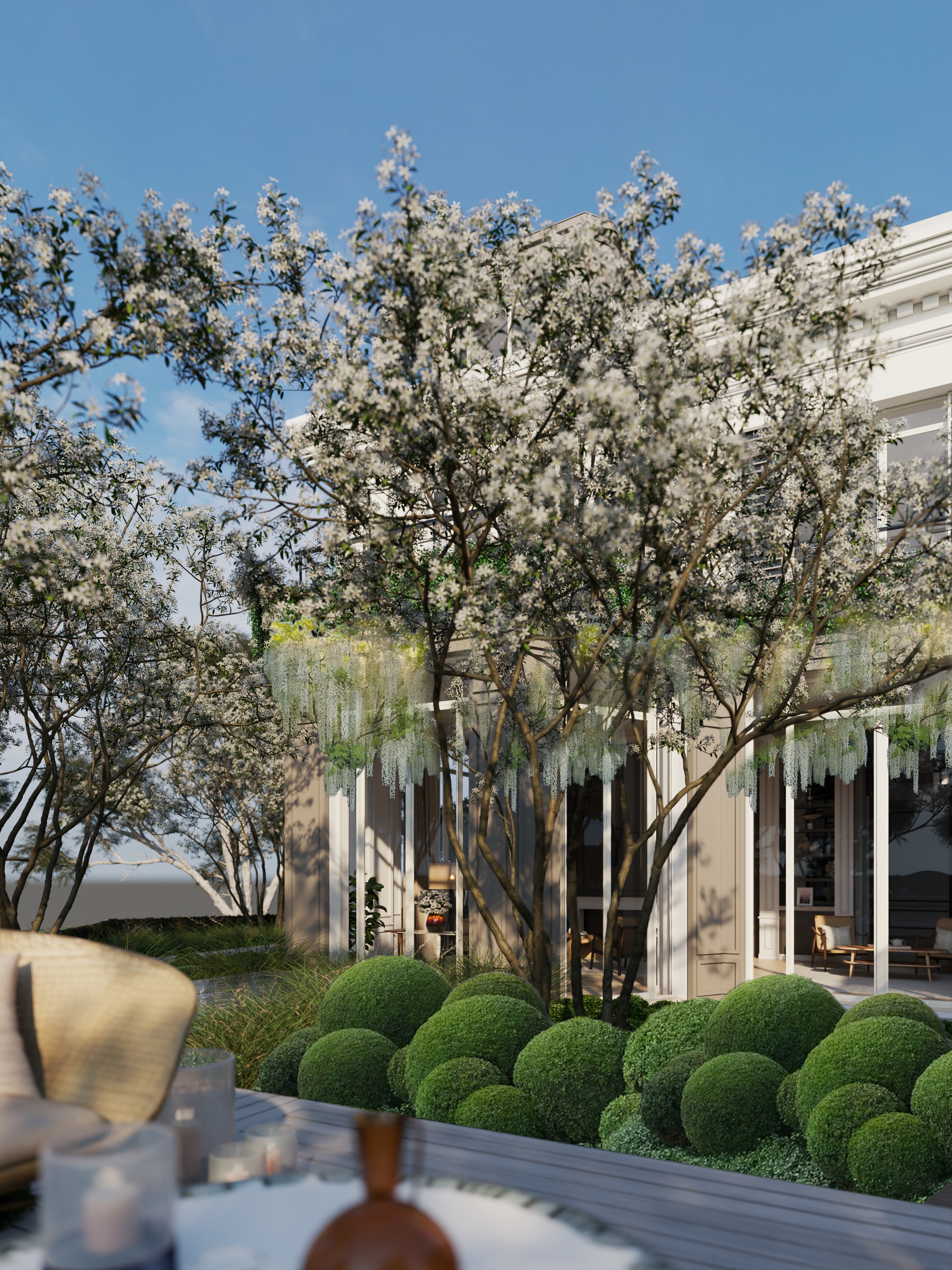 enhance the realistic texture and dawn lighting maintain the elements material and angle of the picture make the wisteria plants behind the trees