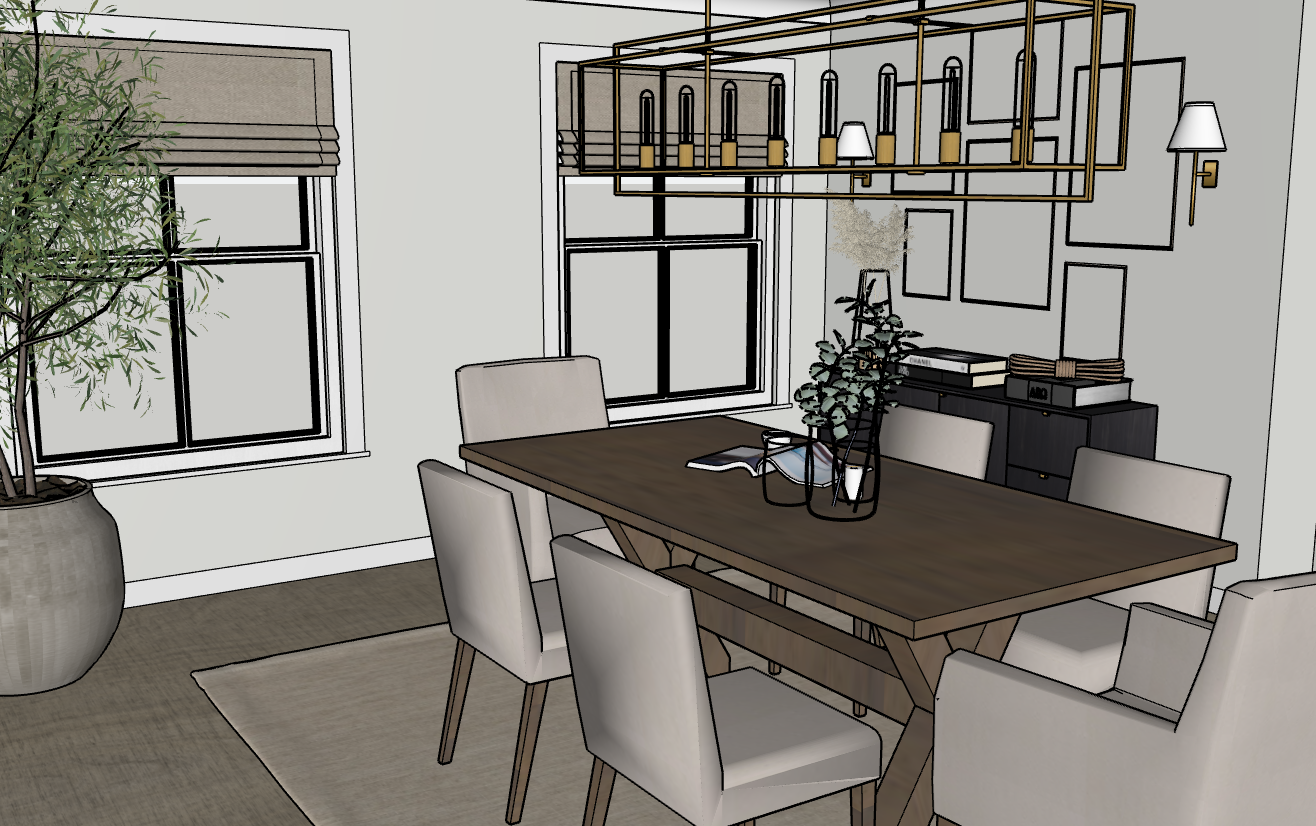 evening setting with wall lights on a soft light and the pendant over the kitchen table turned on