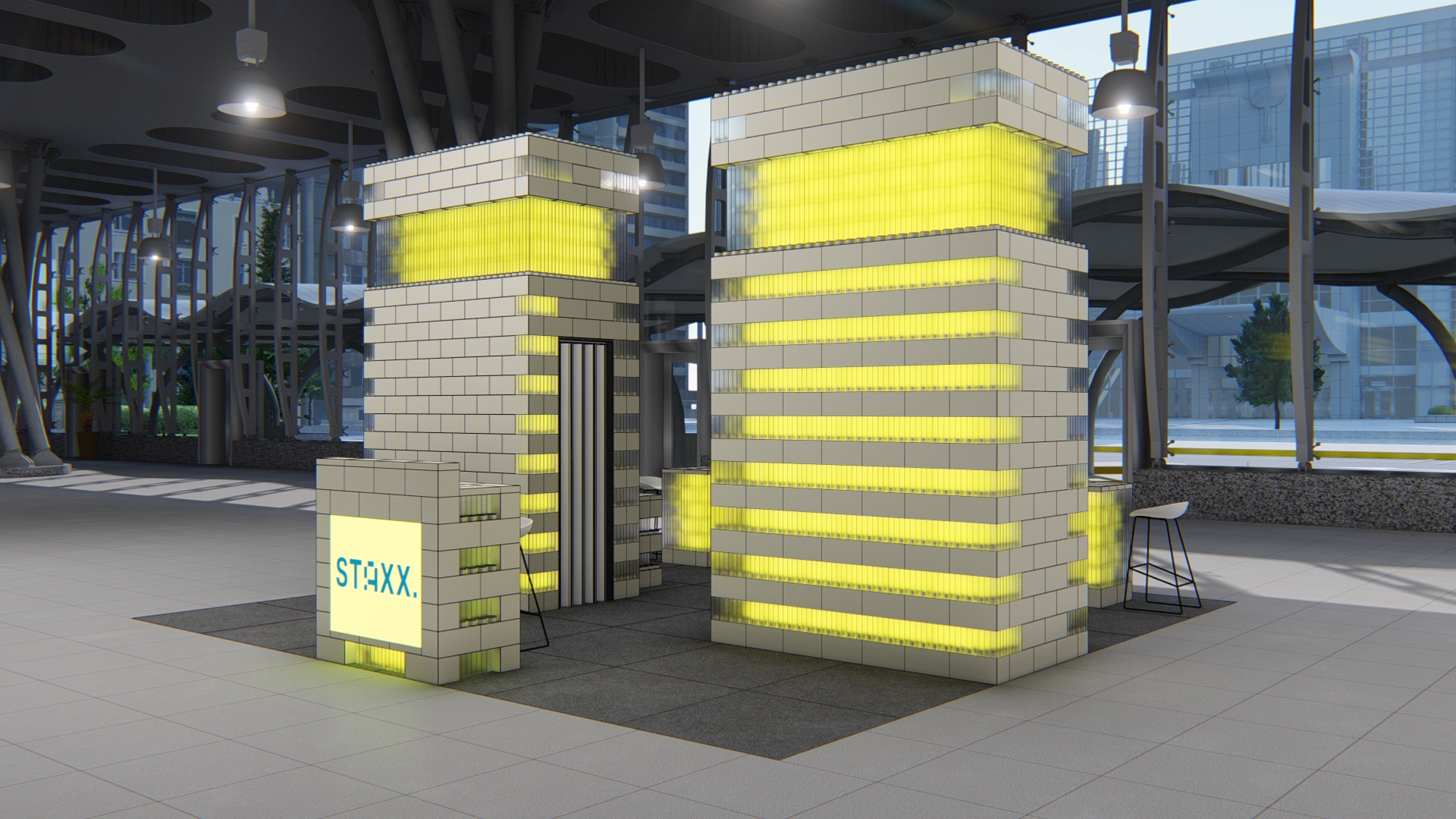 a stunning photorealistic architectural visualization of a modular exhibition booth render with ultra realistic material definition accurate global illumination and physically correct reflections lighting should simulate bright trade show hall conditions with a balance of soft ambient fill and directional spotlights emphasize clean geometry sharp edges and crisp detailing of modular components use wide angle perspective 24 28mm lens equivalent at eye level height with secondary renders in aerial 3 4 view depth of field should remain minimal for full clarity apply high resolution textures matte plastics frosted acrylic brushed metal polished concrete floor ensure shadows are soft but defined output should achieve cinematic realism suitable for professional architectural presentation