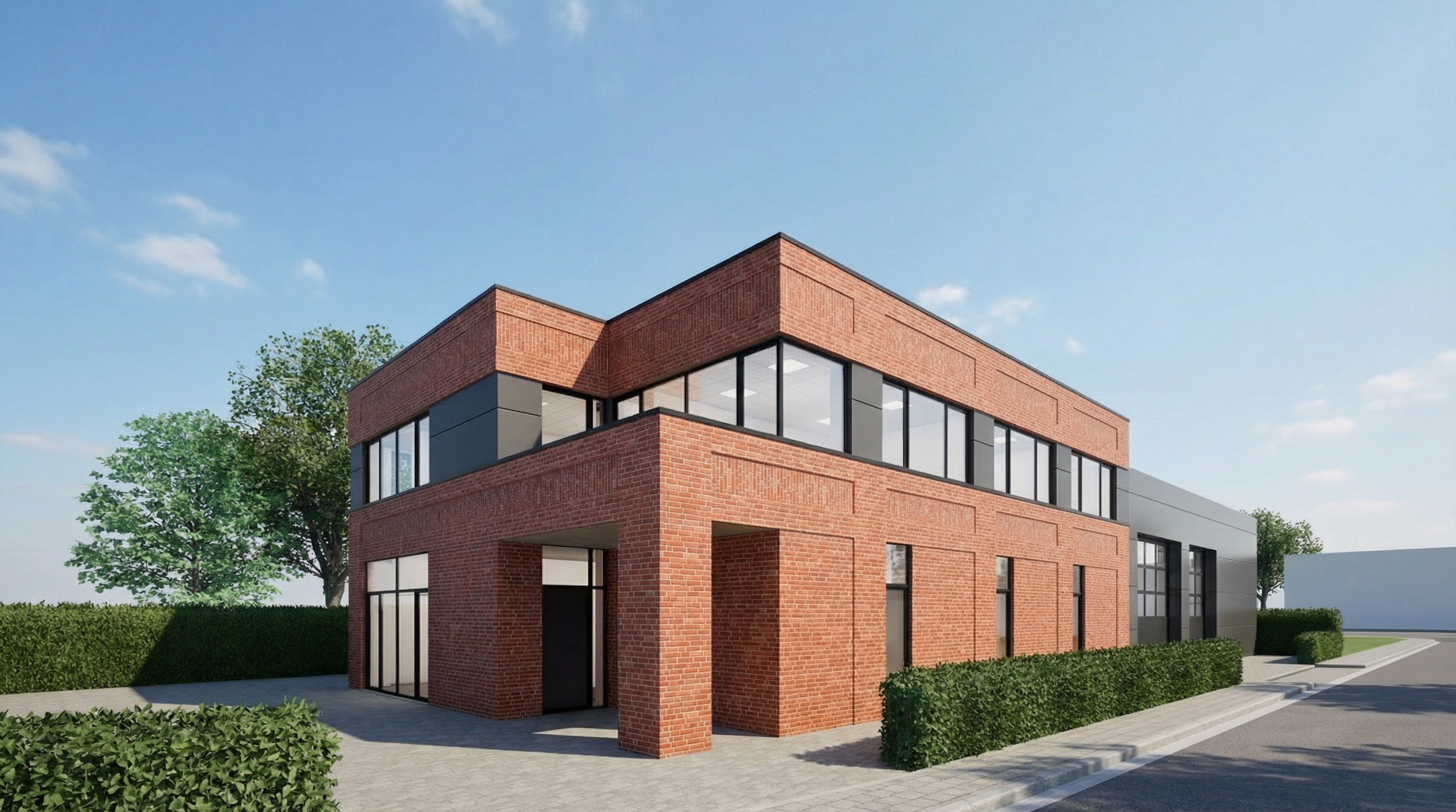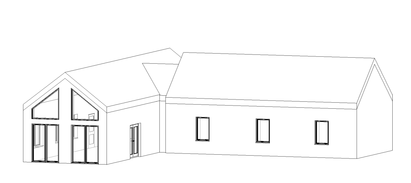 exterior shot add two dormers to the building on the right hand side render that building in white with a slate roof then clad the extension on the left in timber with a grey standing seam metal roof all the windows will have grey frames add a window either side of the french doors on the timber elevation add a chimney to each gable too add some landscaping in front of the house there will be a gravel driveway running from left to right and some grass either side the land to the left will rise slightly and there are some trees on the right