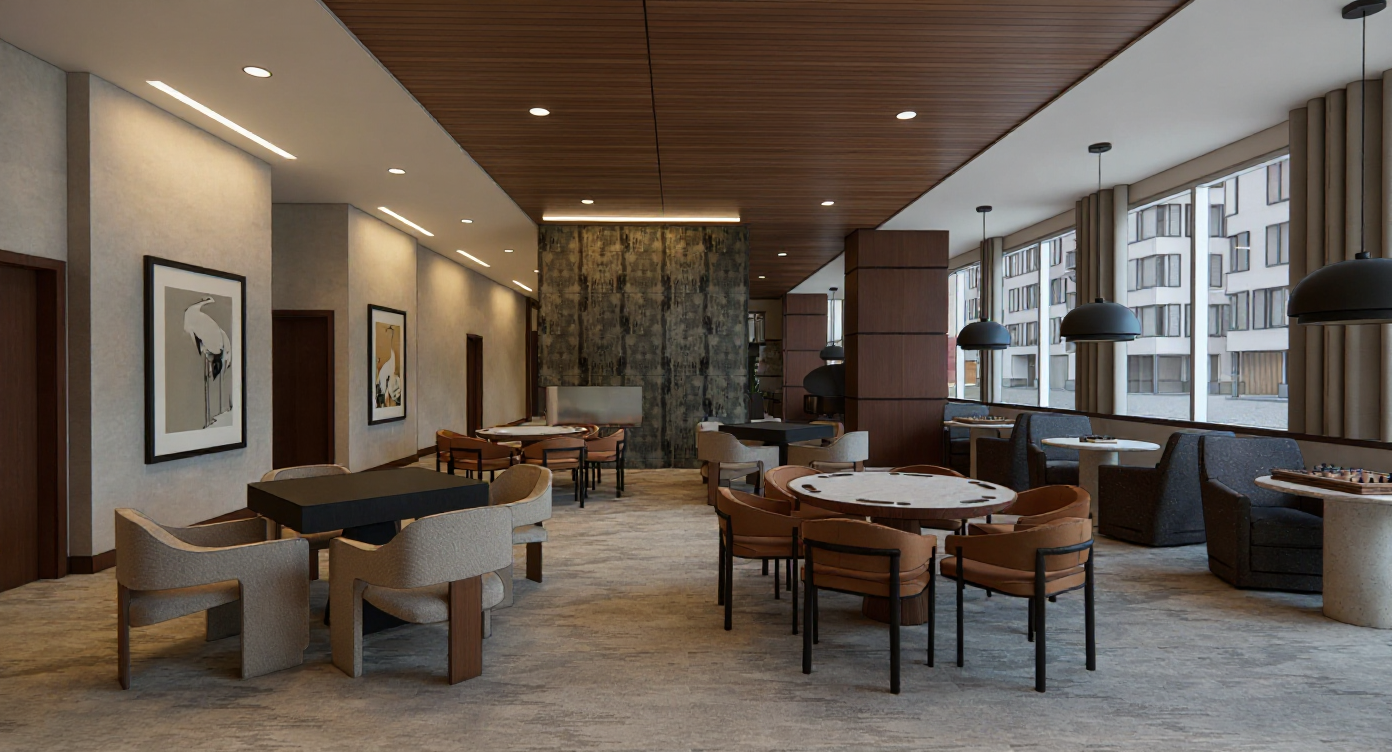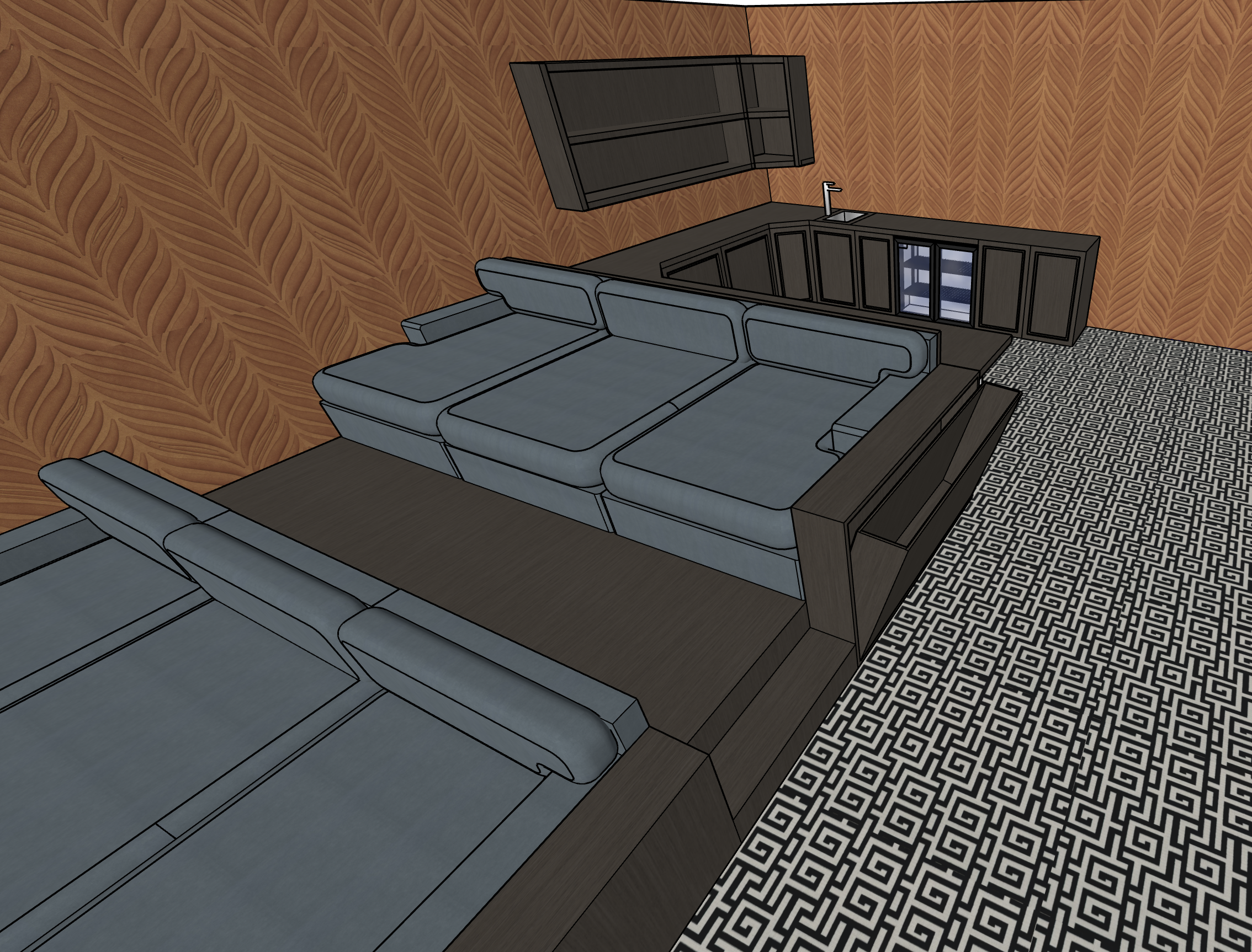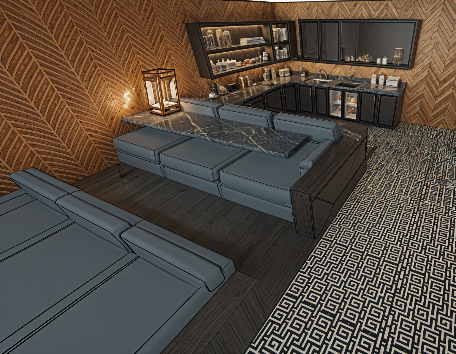 render a modern living room with luxurious aesthetics design a spacious lounge with sleek dark brown wooden furniture the cozy sectional sofas should be upholstered in a soft slate gray fabric the walls feature an elegant textured terracotta wallpaper with subtle leaf patterns the flooring is adorned with a black and white geometric greek key tile design incorporate a contemporary kitchenette with minimalist black cabinets and a stylish sink area the overall ambiance should be sophisticated and comfortable perfect for relaxation and entertainment