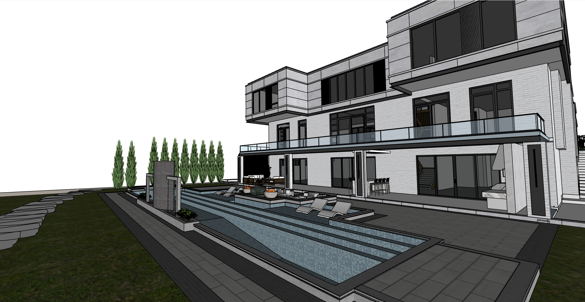 modernist exterior shot ultra realistic render of a modern residential house keep the exact model and proportions exterior finished with large white to very light gray precast stone panels modern pivot entrance door black aluminum triple glazed windows minimalist luxury design clean lines realistic stone texture realistic glass reflections soft natural lighting premium architectural photography high end curb appeal there is swimming pool in the back yard as well with fountains architecture