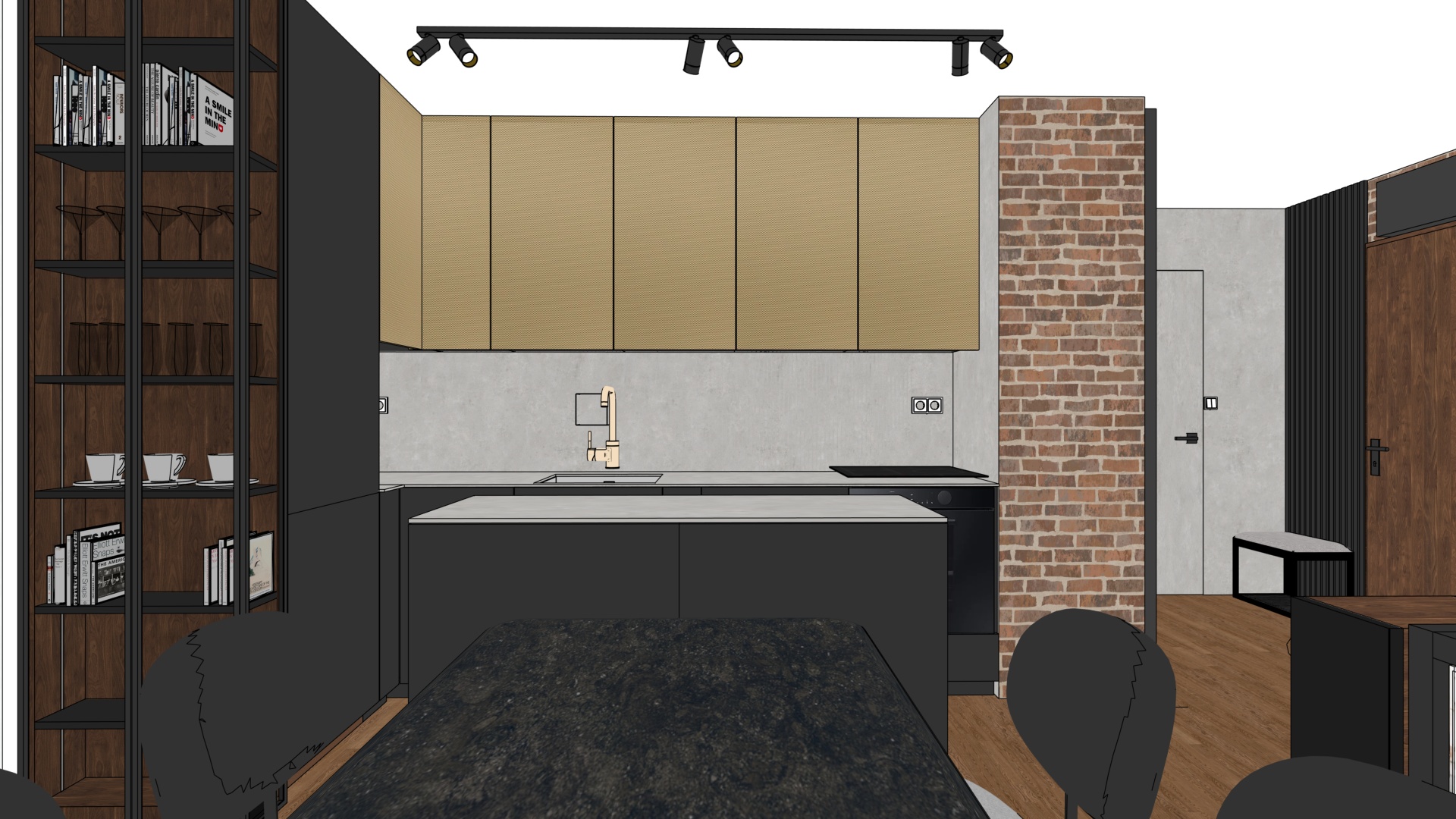 pomieszczenie kuchnia po prawej stronie w oddali wida ukryte drzwi pokryte tynkiem o strukturze betonu ceg a na cianie z lewej strony wpada wiat o do pomieszczenia dolne fronty zabudowy meblowej w kolorze antracyt