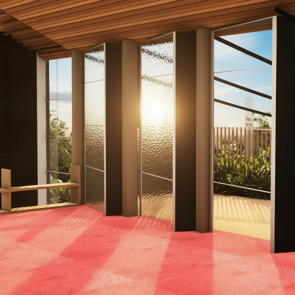 revert and only add the textured glass make it a warm image with sunrise light