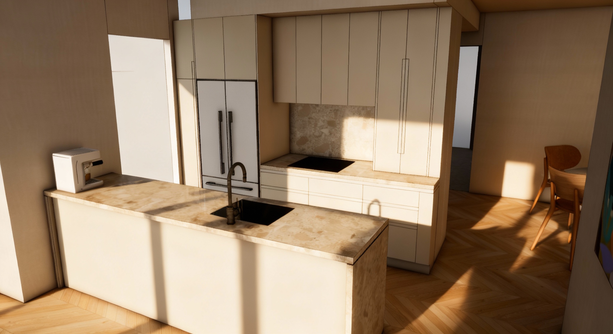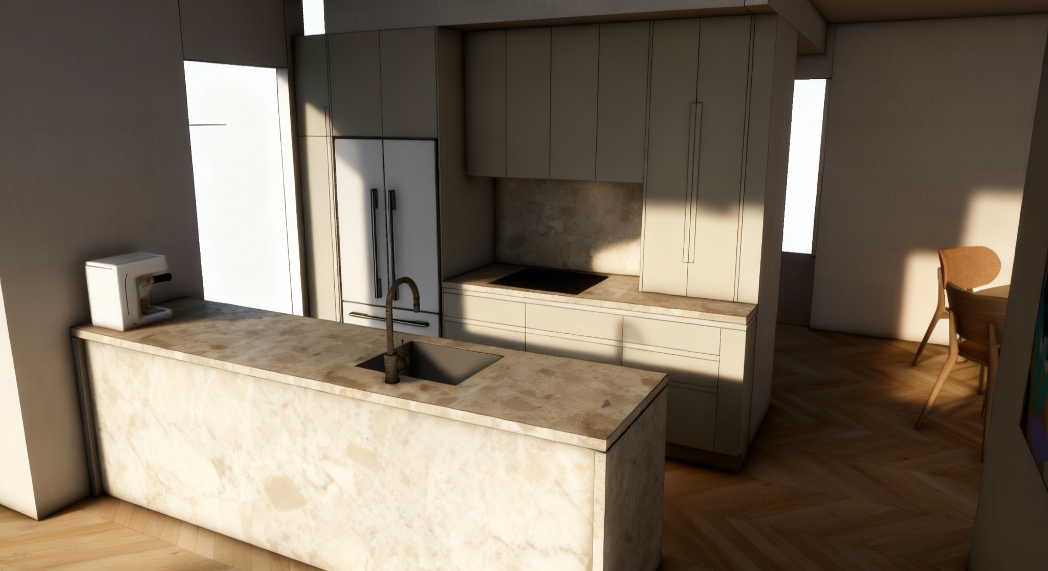 concrete floor white walls black double height ceiling big art work add burgandy and black pendents lighting glass and pottery make the buffet wider marble of the dinning table top is calacutta viola the base is travertine marble put only 6 chairs around the dinning table add 2 wall lights beside the art work same style as light pendants