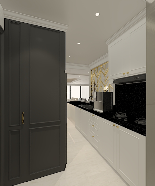 use warm light ambiance enhance the classical modern kitchen and enhance the realistic rendering on this 3d image using beige marble glossy finish by use the same texture on the image right now enhance the realistic render of this image help to make the kitchen appliances to be as real as possible too
