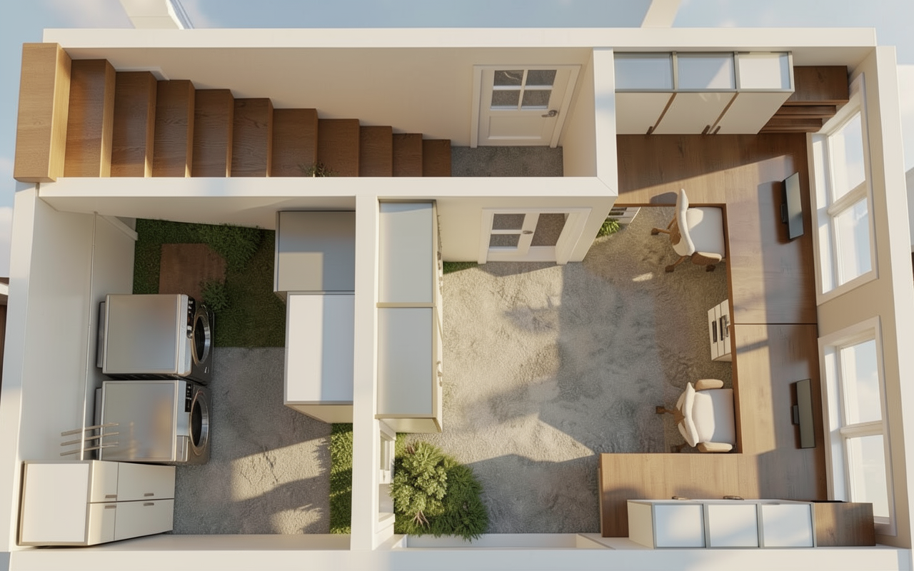 add a few cars in parking lot keep top view site map natural lighting keep the size as is blue water keep the aerial dead on top view