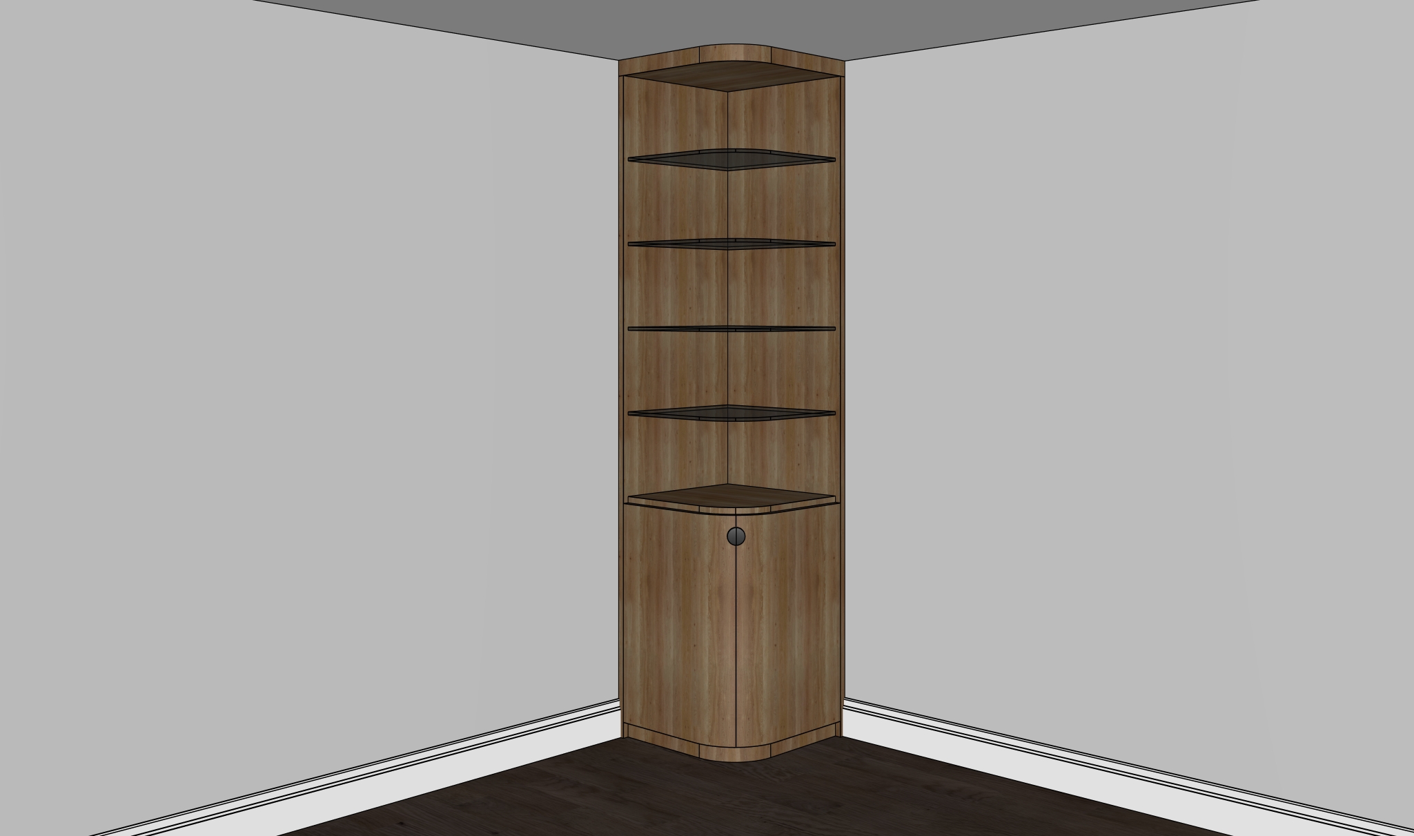 render this corner cabinet add led strip inside the shelfing inside is glass with a half glass half walnut wood finish add accessories inside place it in a room still corner make the walnut finish less harsh and the led light less harsh