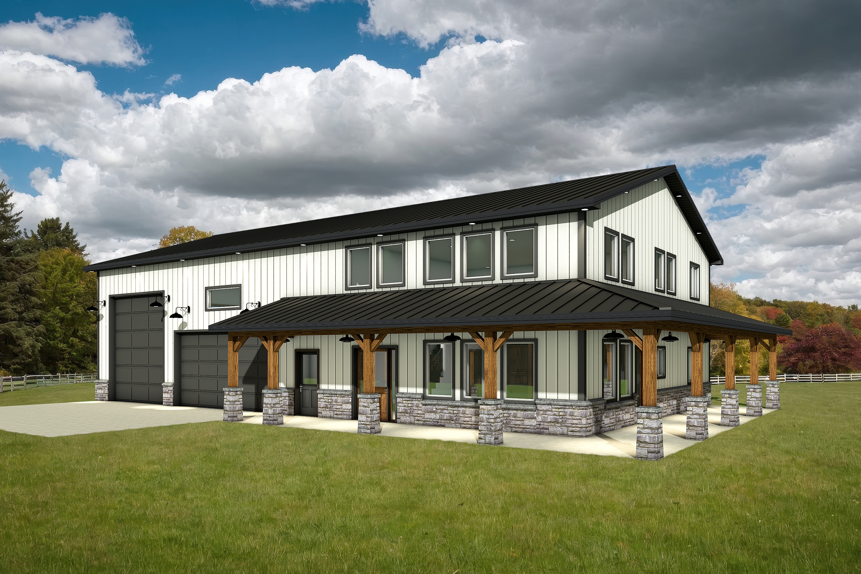 a modern house retain the exact structure metal roof colors and window arrangement rooflines siding foundation height and proportions exactly as shown in the reference image integrate into the terrain there are just a few trees mixed hardwoods that are mostly on the sides of the image add cooler afternoon sunlight subtle dappled highlights across the siding and grass create ultra realistic lighting crisp shadows detailed textures in the siding and glass reflections and an overcast sky show only a few lights visible inside render in hyper realistic architectural visualization quality 8k resolution add a driveway tying into the concrete garage door apron make it the summer season add realistic landscape