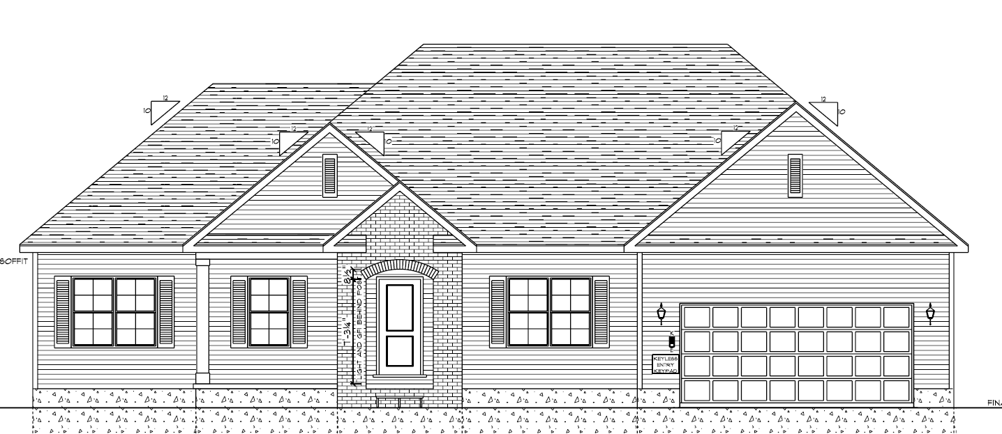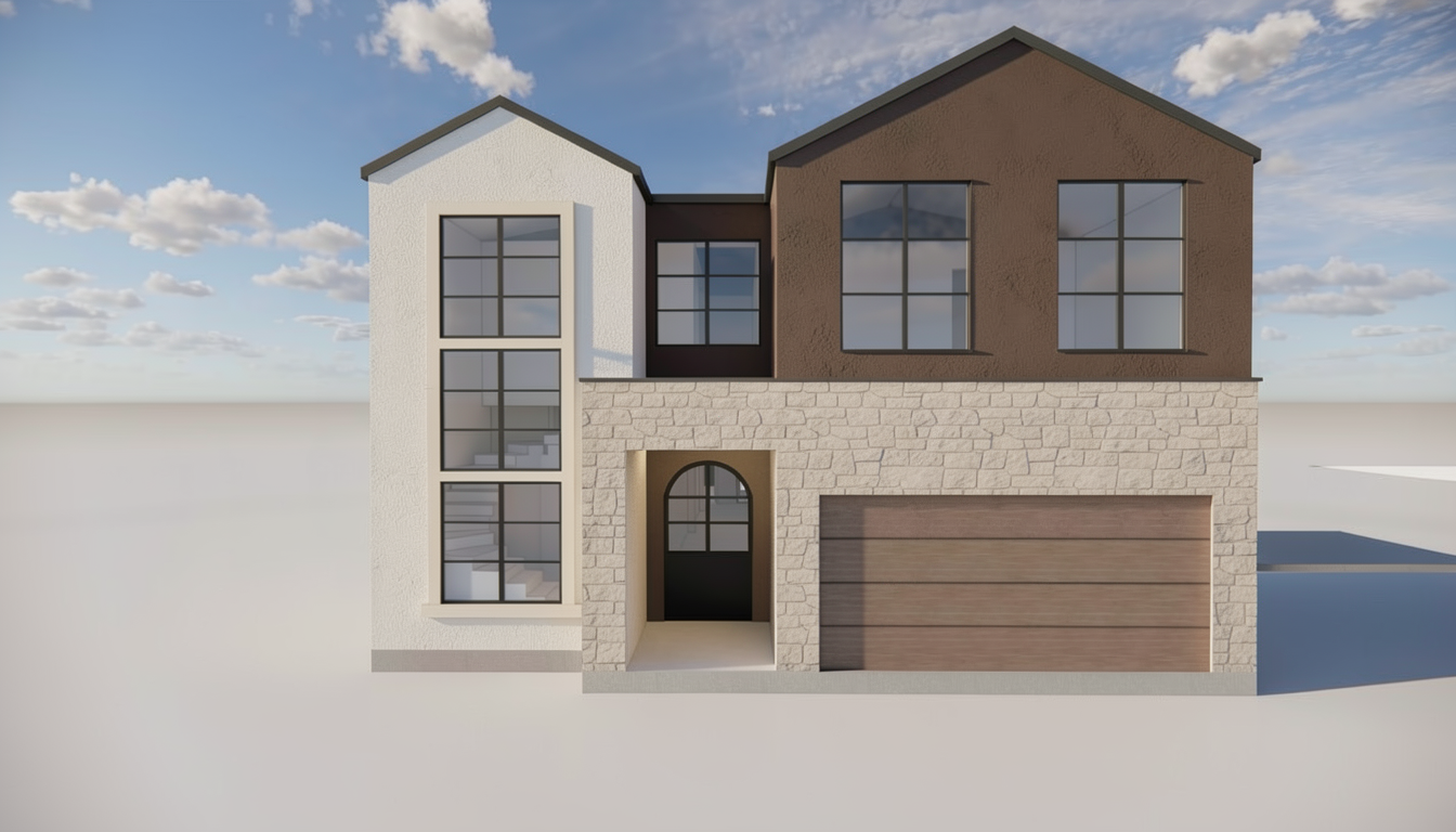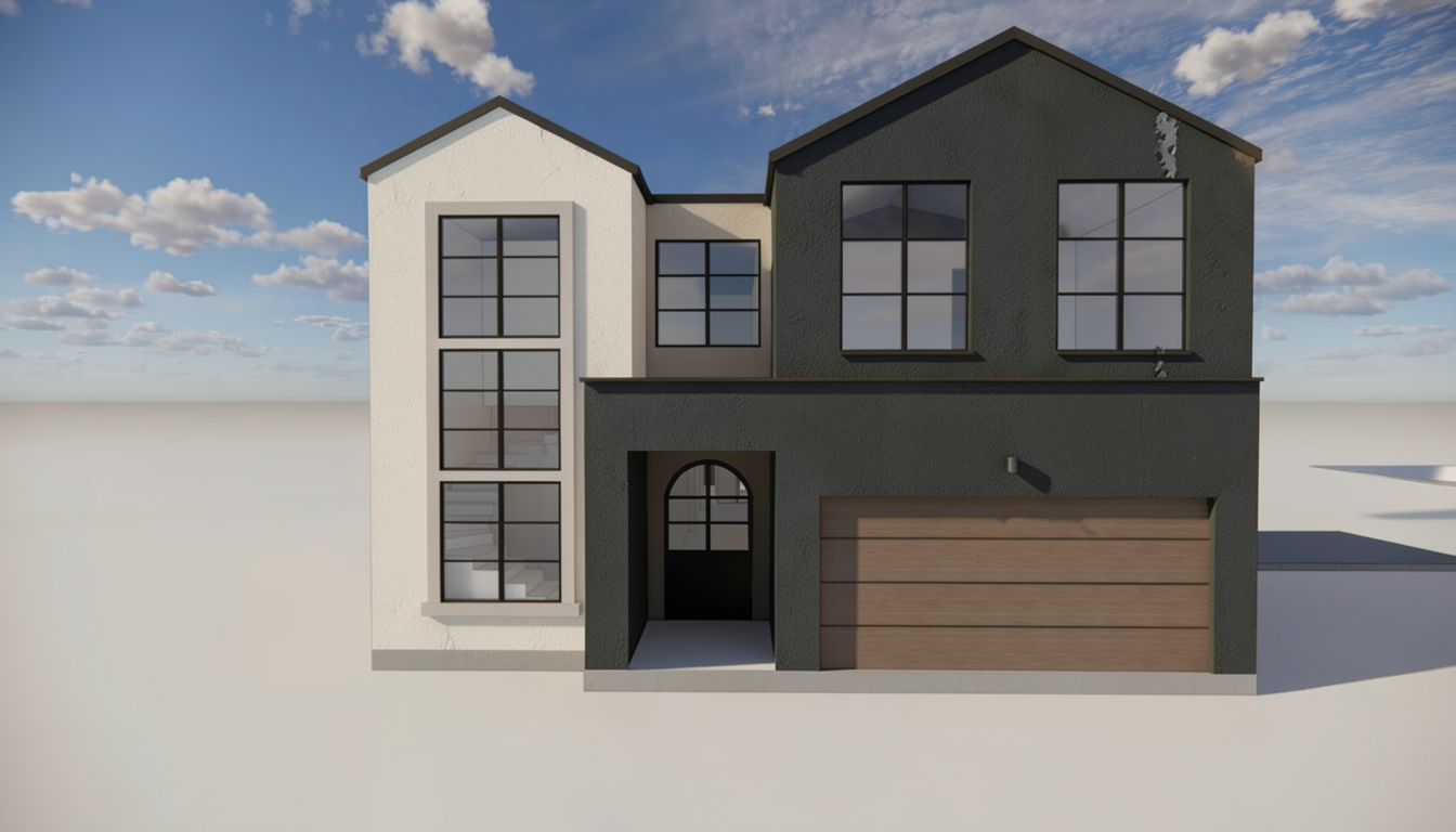 make as photorealistic as possible while keeping textures the same as selection professional landscaping in a lightly wooded scene with good lighting dark grey siding dark roof only show the brick to match the plan