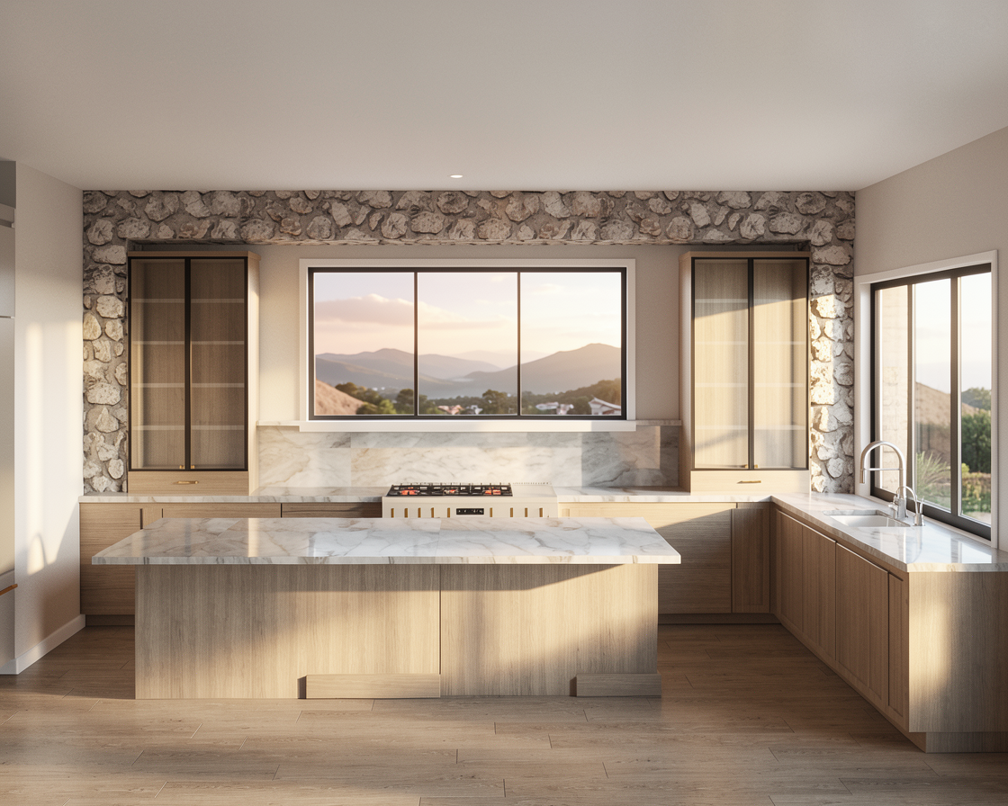 create a modern outdoor patio scene render type using the floor plan for position of items and scale of the image the background if the 4th image of the house capture the atmosphere of a peaceful summer afternoon the ground should be a natural earthy green render the wooden deck in light oak brown with a smooth finish the ac units should appear in sleek white with metallic gray fans on the left side of the white building the shrubs should be a vibrant rich green the main rectangular area will have a slate gray concrete texture the table and chairs will have a modern minimalist design in charcoal black surround the area with soft warm sunlight to enhance the tranquil and inviting ambiance