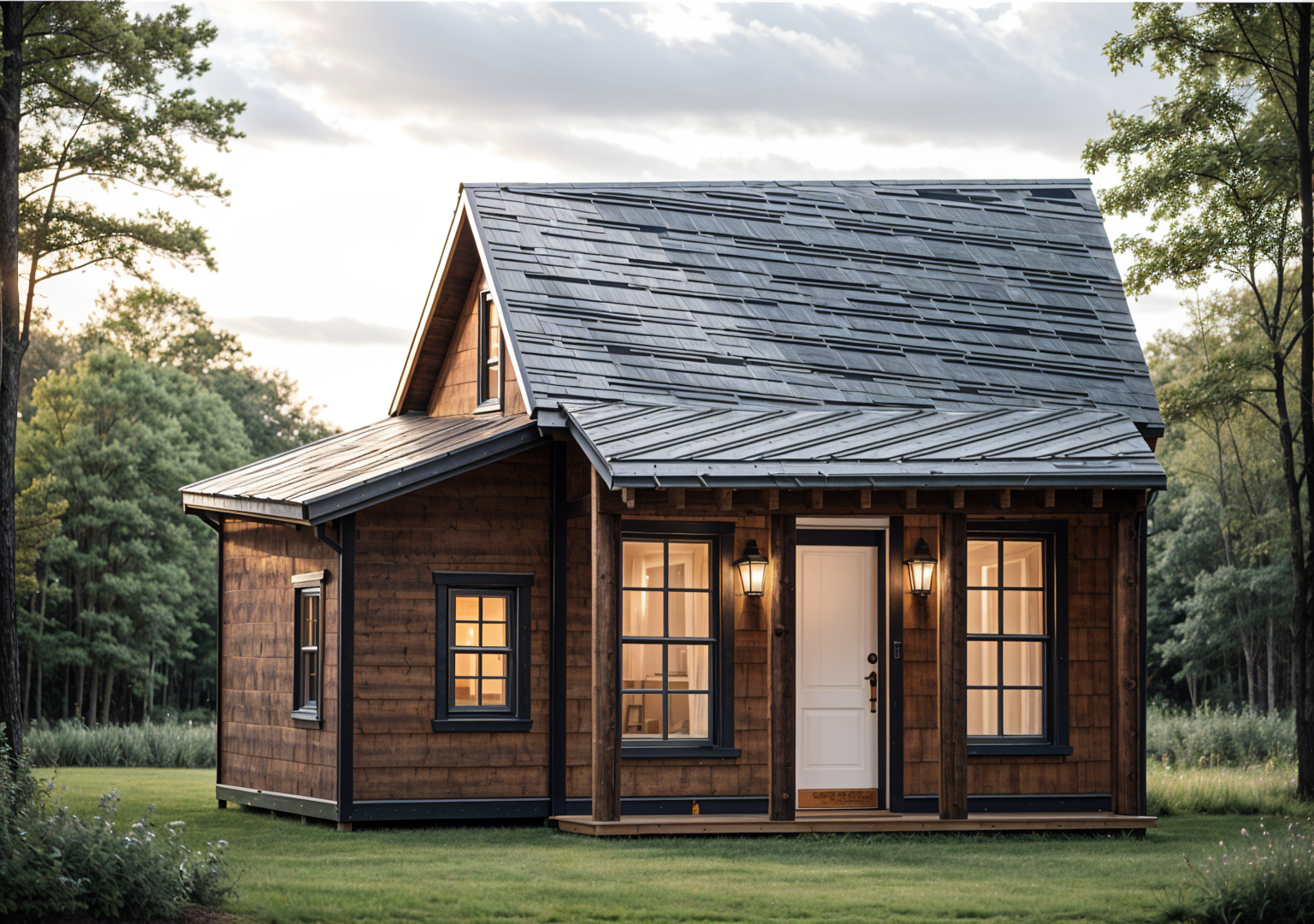 modern stone veneer on short pillars with limestone coping on top black metal frame with black contemporary metal railing and lighter wood color floor trim molding show stream flowing underneath bridge