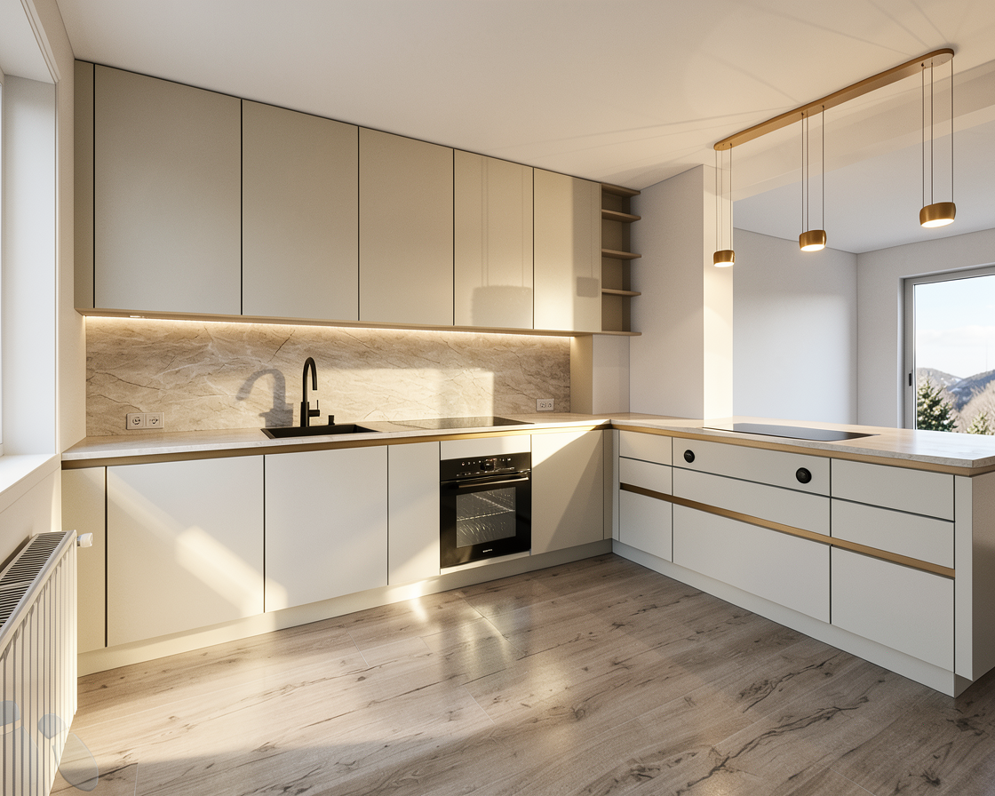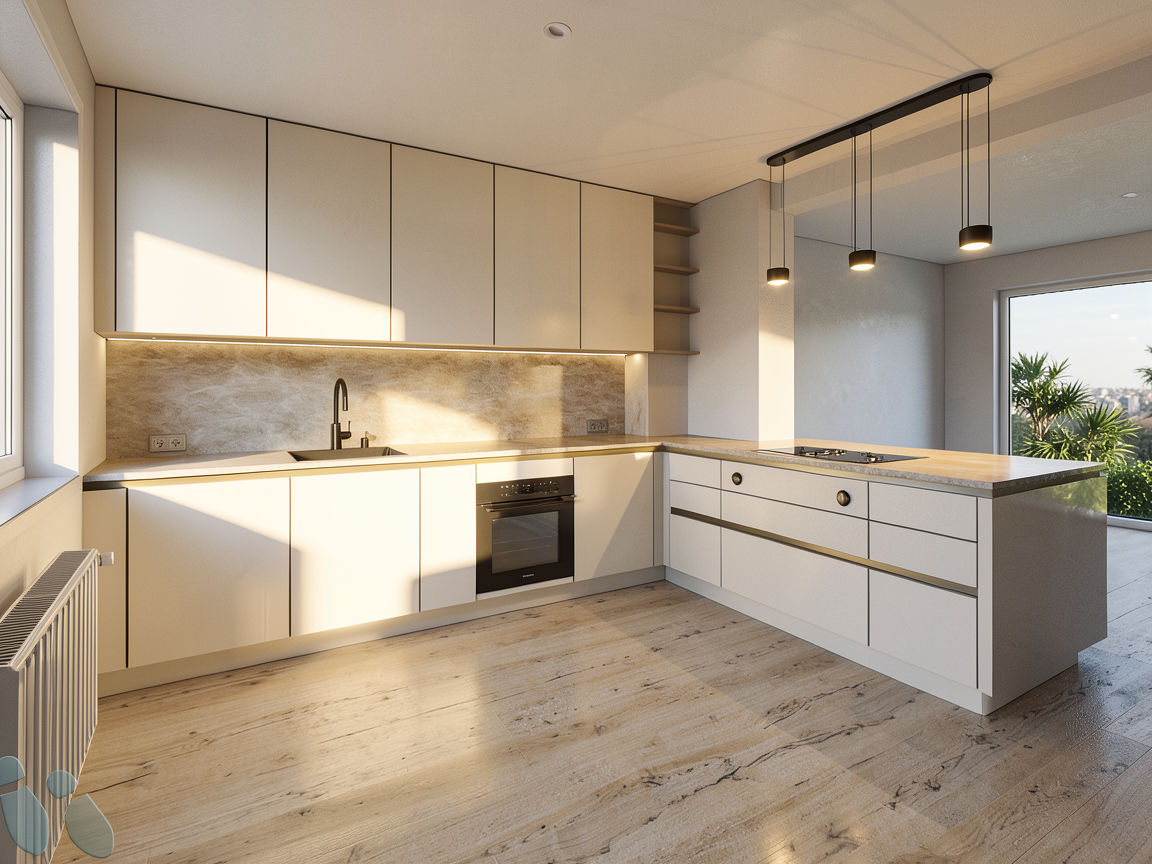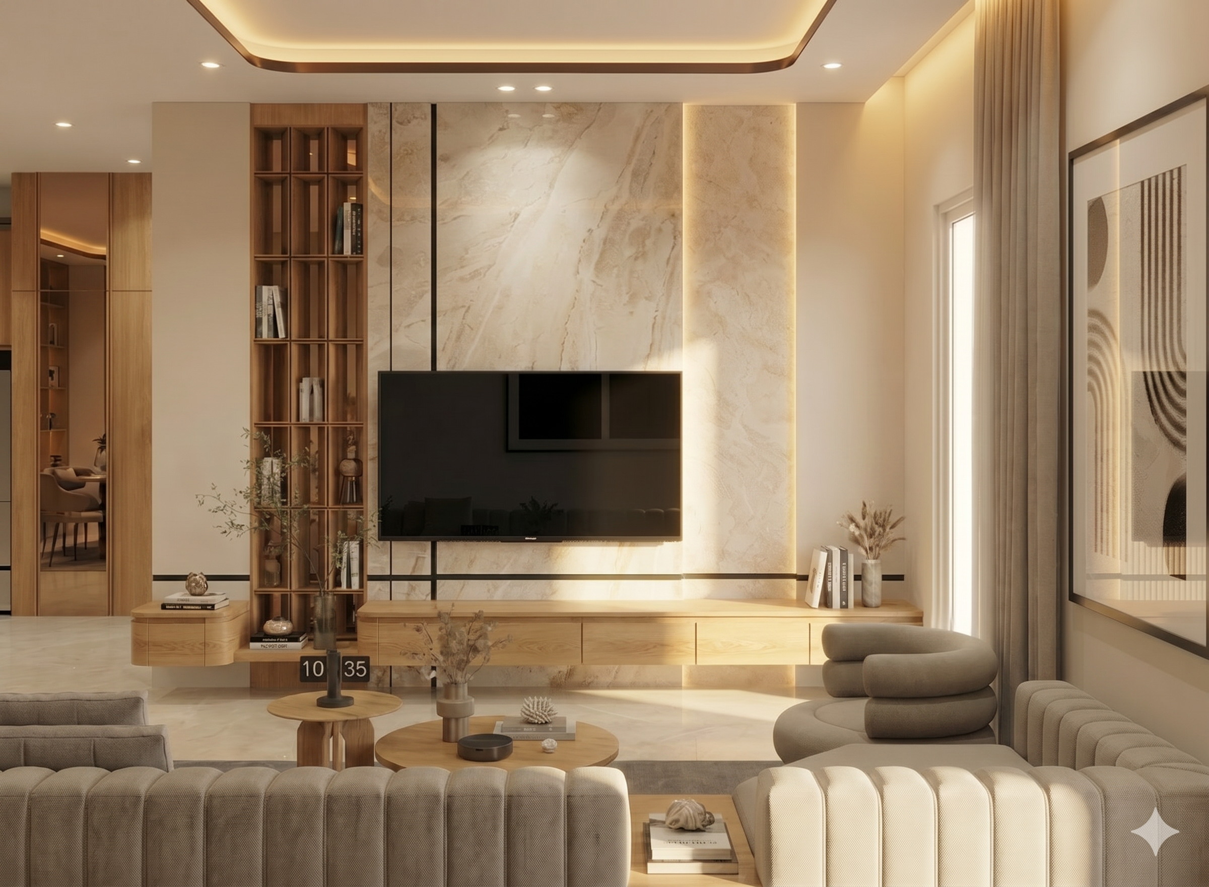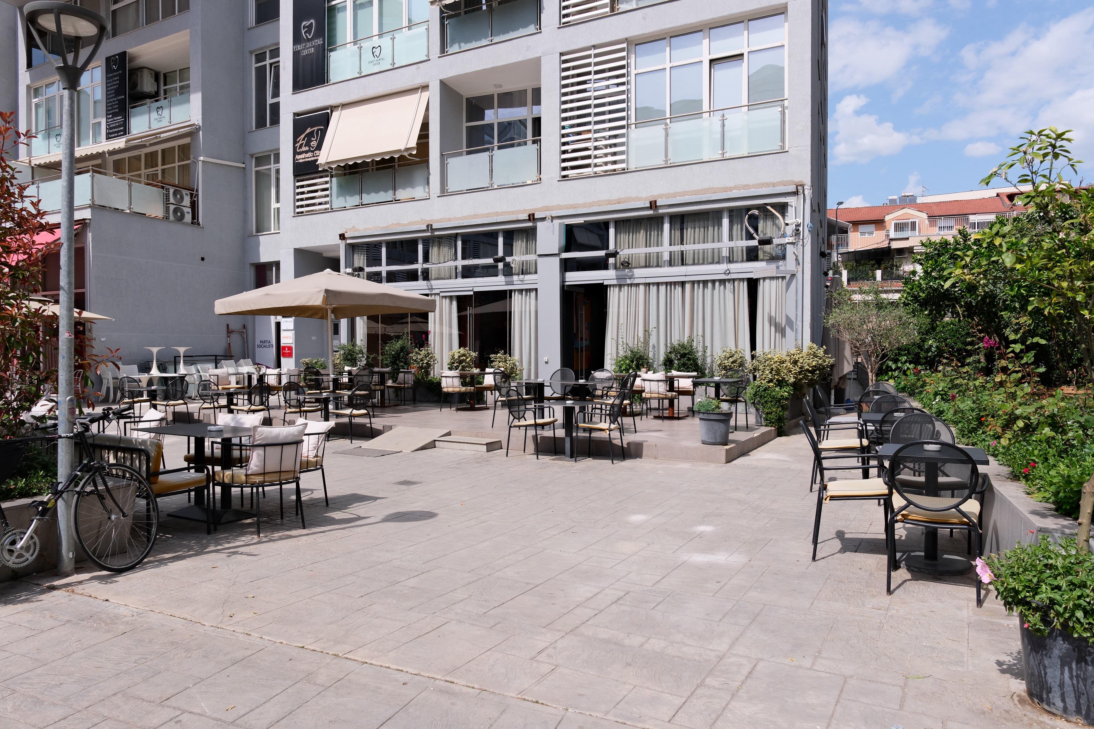 transform this modern outdoor caf patio with a mediterranean spanish vibe add a large fabric awning attached to the glass fa ade featuring bold red and white vertical stripes slightly soft and flowing introduce elegant red umbrellas with subtle white embroidered edges evenly distributed across the seating area replace existing chairs with black metal frame chairs combined with warm wood elements styled with red and white striped cushions add small round caf tables with dark metal bases and light stone or wood tops enhance the floor with textured natural stone tiles in warm grey beige tones slightly irregular for an authentic feel include lush greenery in terracotta pots climbing plants near the fa ade and soft shadows for a warm afternoon ambiance lighting is soft mediterranean sun realistic high end architectural visualization ultra detailed 4k natural materials cozy yet refined atmosphere
