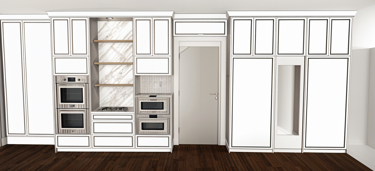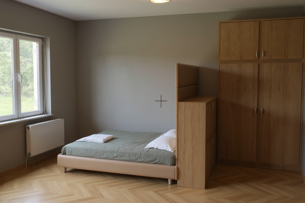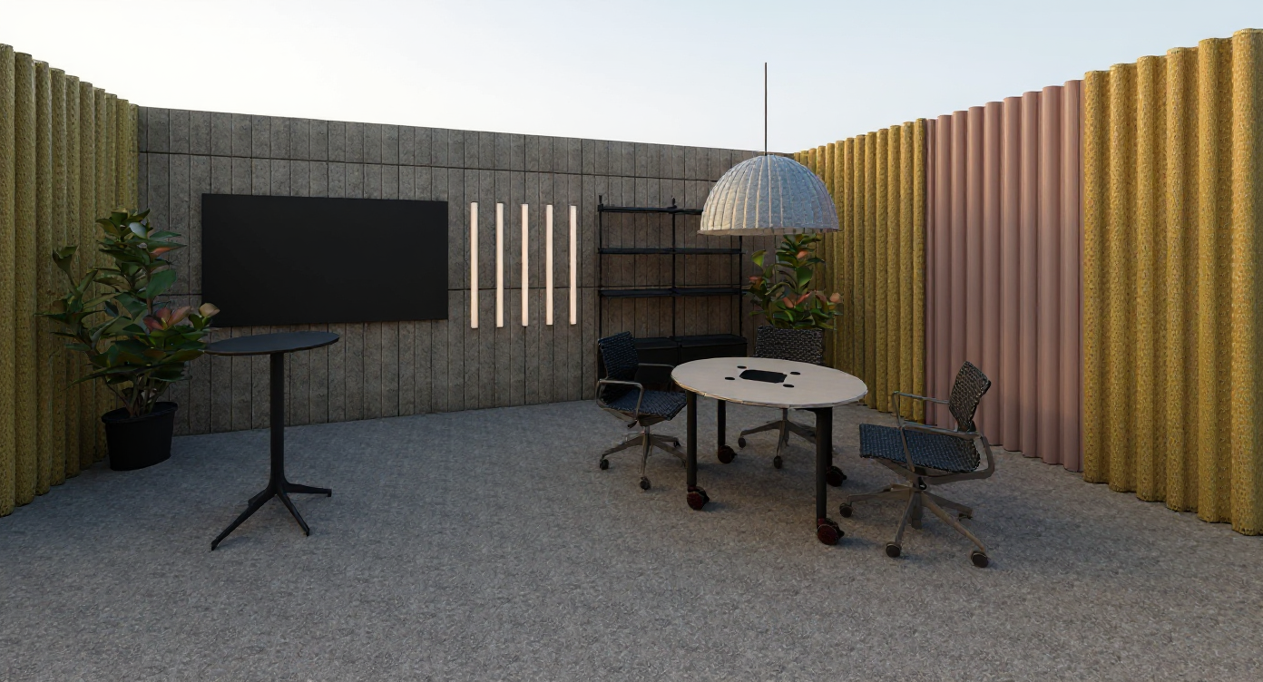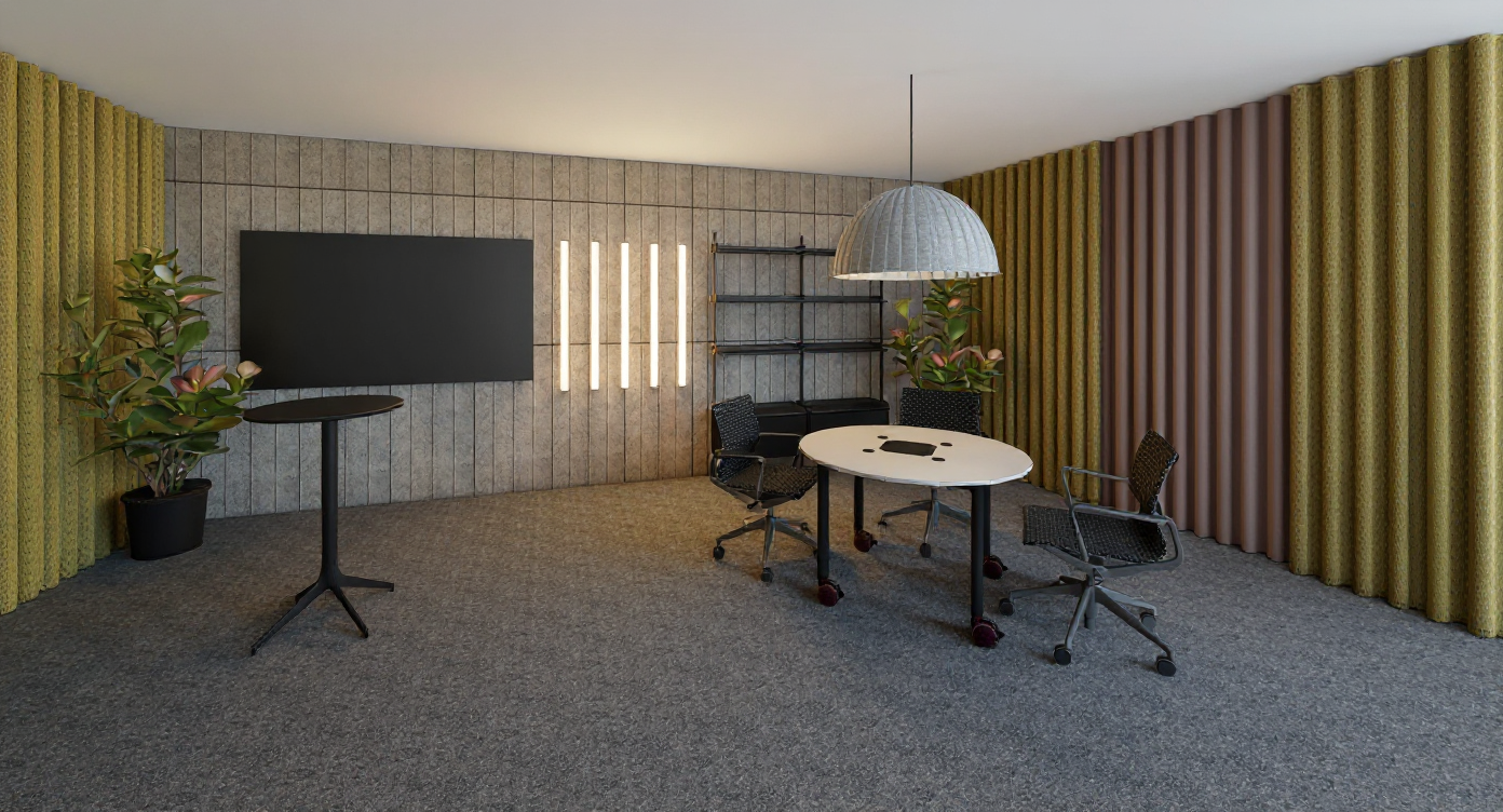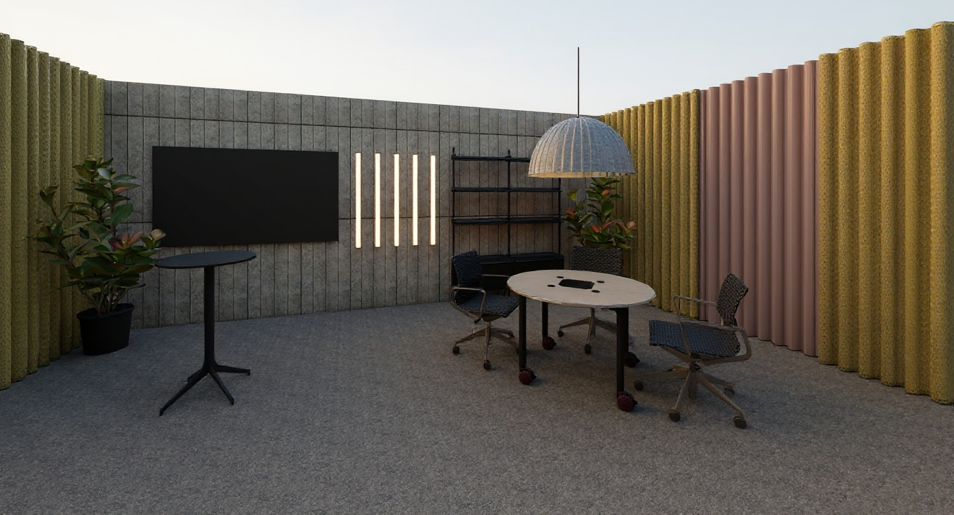 make this interiore view photorealistic with a dusk time setting wall lights above doors to glow ceilking pendants to glow