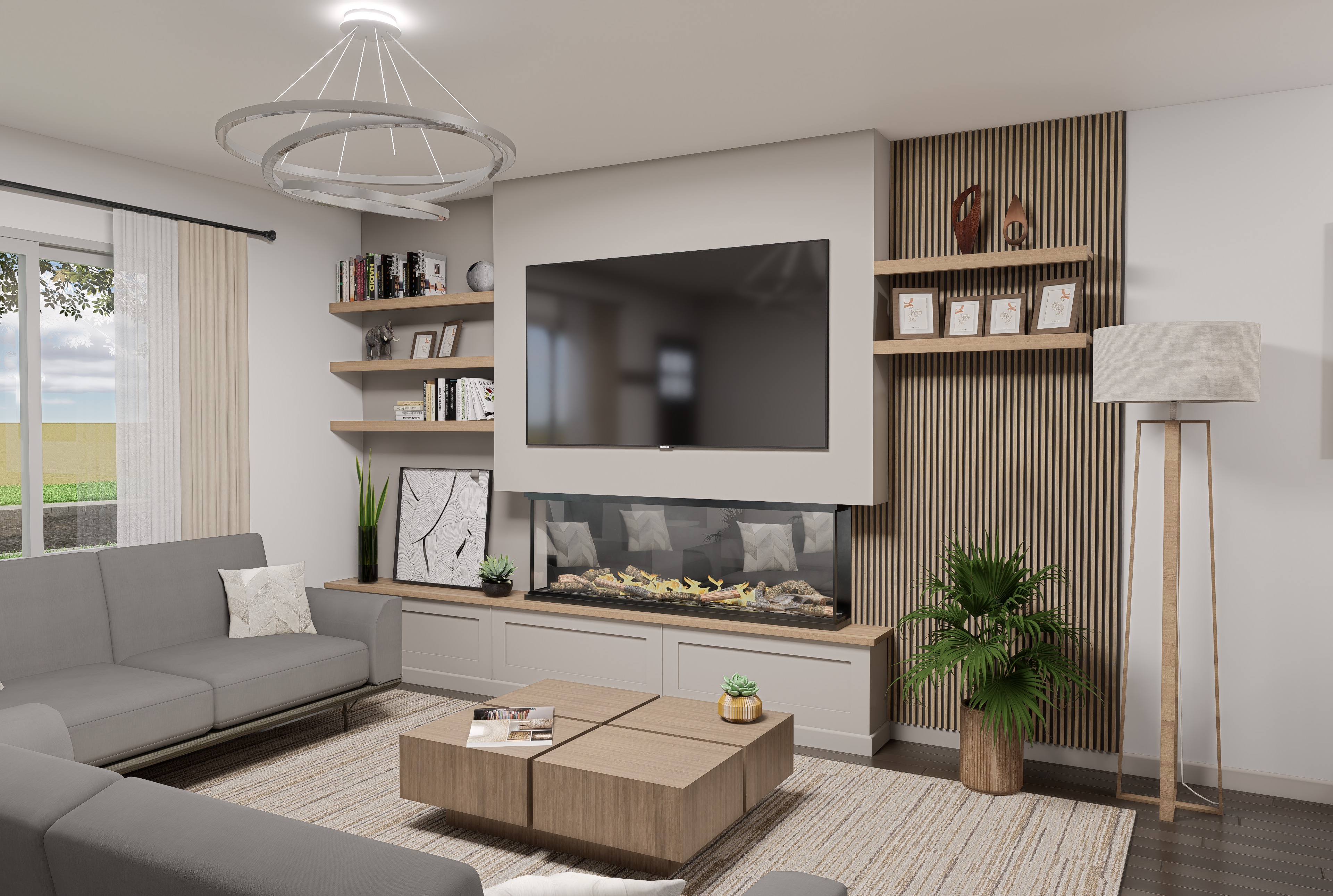 interior architectural visualization of a modern living room photorealistic 8k resolution features a large wall mounted tv over a linear glass fireplace accent wall with vertical oak wood slats modern furniture including a gray sectional sofa with textured fabric and a low profile square wooden coffee table lighting includes a contemporary silver triple ring led chandelier and a minimalist wooden tripod floor lamp with a linen shade natural lighting from a side window with soft sheer curtains high quality textures on materials brushed metal grain matched oak wood and soft wool rug cinematic lighting soft shadows global illumination ray tracing highly detailed decor interior design magazine style