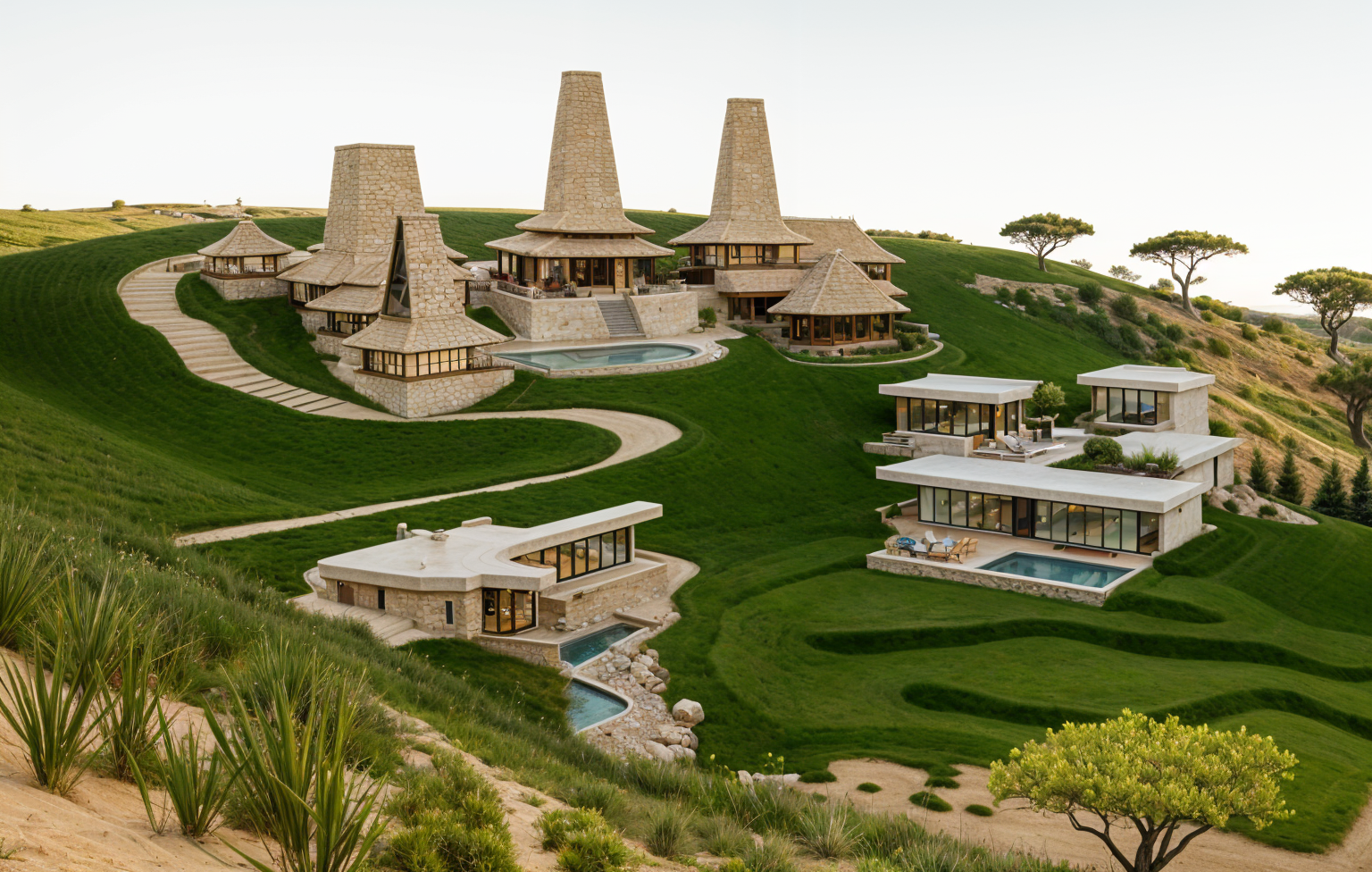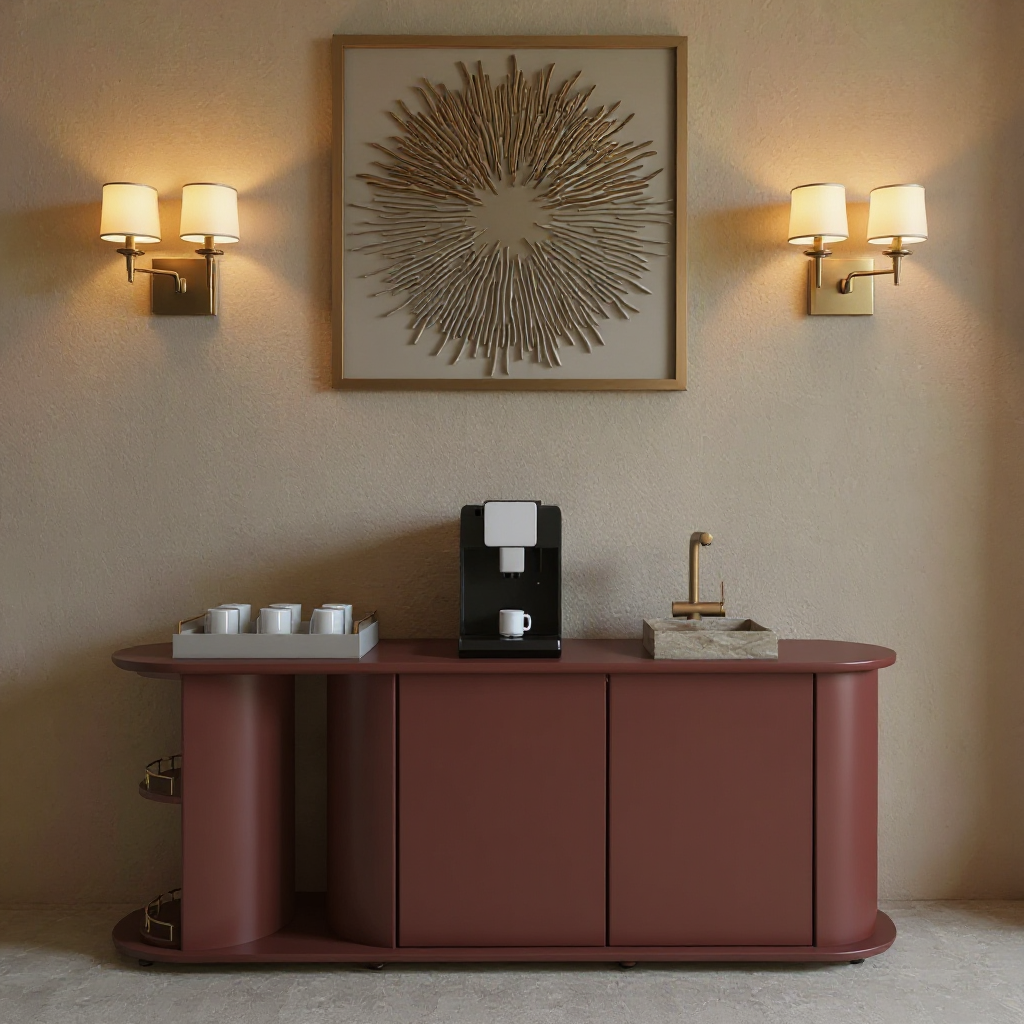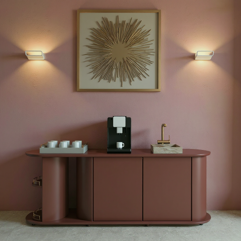black upholstered fabric seating black floor black wooden panels and mirrors above 2 meters on wall mirror duplicating white circular lights