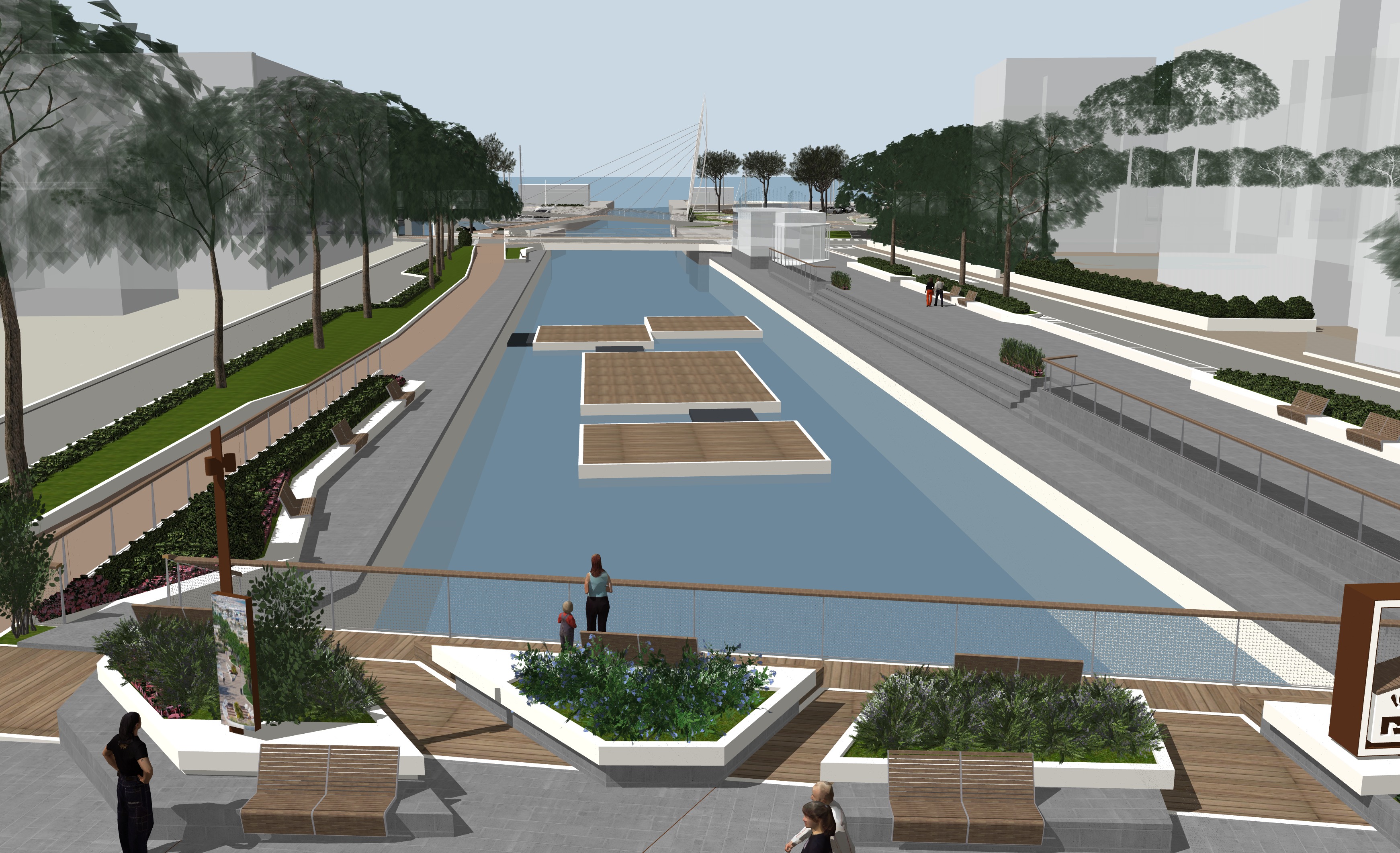new street furniture on the river it s a warm summer evening on the four floating platforms in the water a small band is playing and numerous acrobats and jugglers are putting on a show many people are watching the show from the docks sitting on the steps and from the bridge enjoying themselves immensely the entire area is illuminated with atmospheric lighting keep the surrounding buildings abstract without adding windows doors decorations or other details