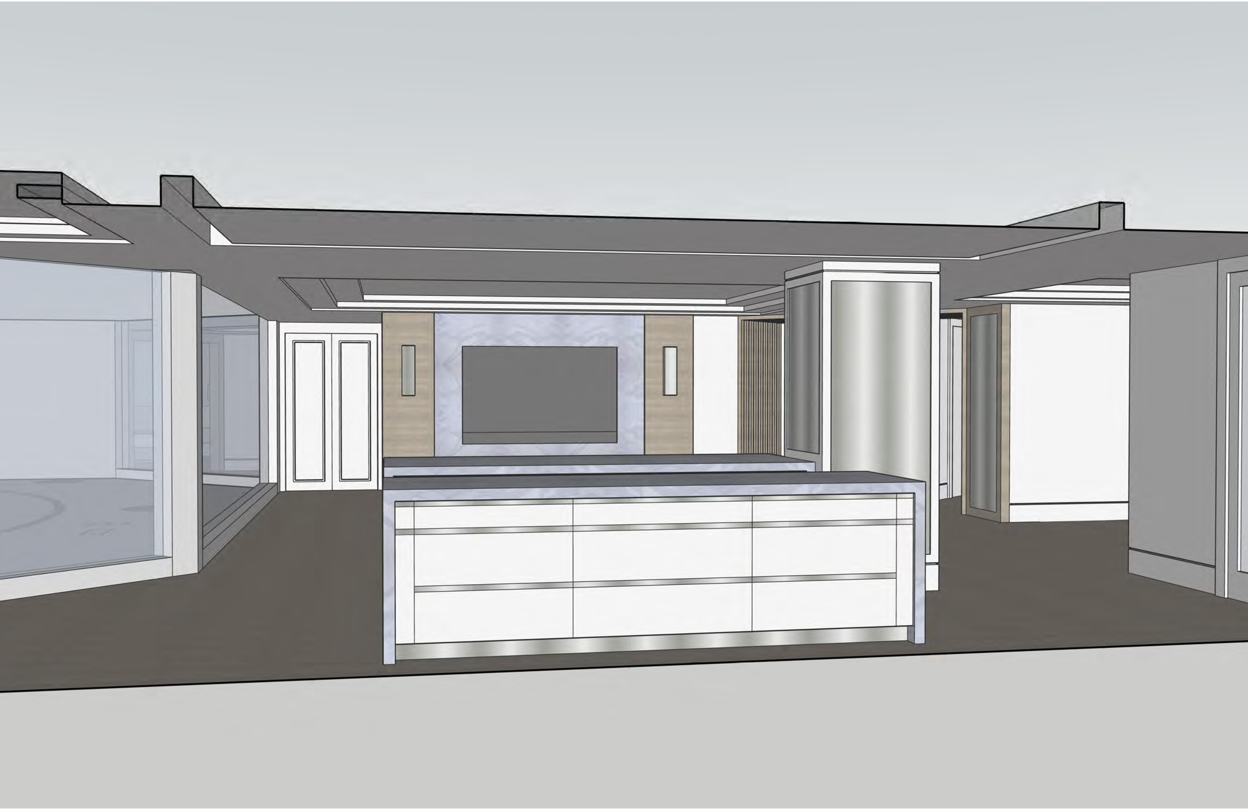 transform this image into a hyper photorealistic rendering while preserving the exact original geometry design layout proportions ceiling details wall depths openings doors cabinetry locations millwork dimensions island proportions built ins and circulation paths with zero architectural changes replace all textures with high quality real world materials including wood surfaces that must appear as smooth solid plank the grey area in the island colum is a mirror polished stone and slab surfaces must have light natural veining with subtle variation and layered depth veins should be soft and organic never bold busy or high contrast and smooth painted surfaces add luxury interior lighting with subtle reflections realistic shadows and daylight ambience maintain the original design intent precisely enhancing only the materials and lighting render the scene with editorial realism suitable for a luxury interior design magazine crisp details refined depth photorealistic finishes daylight interior and elegant atmosphere turn picture into a hyper photorealistic rendering