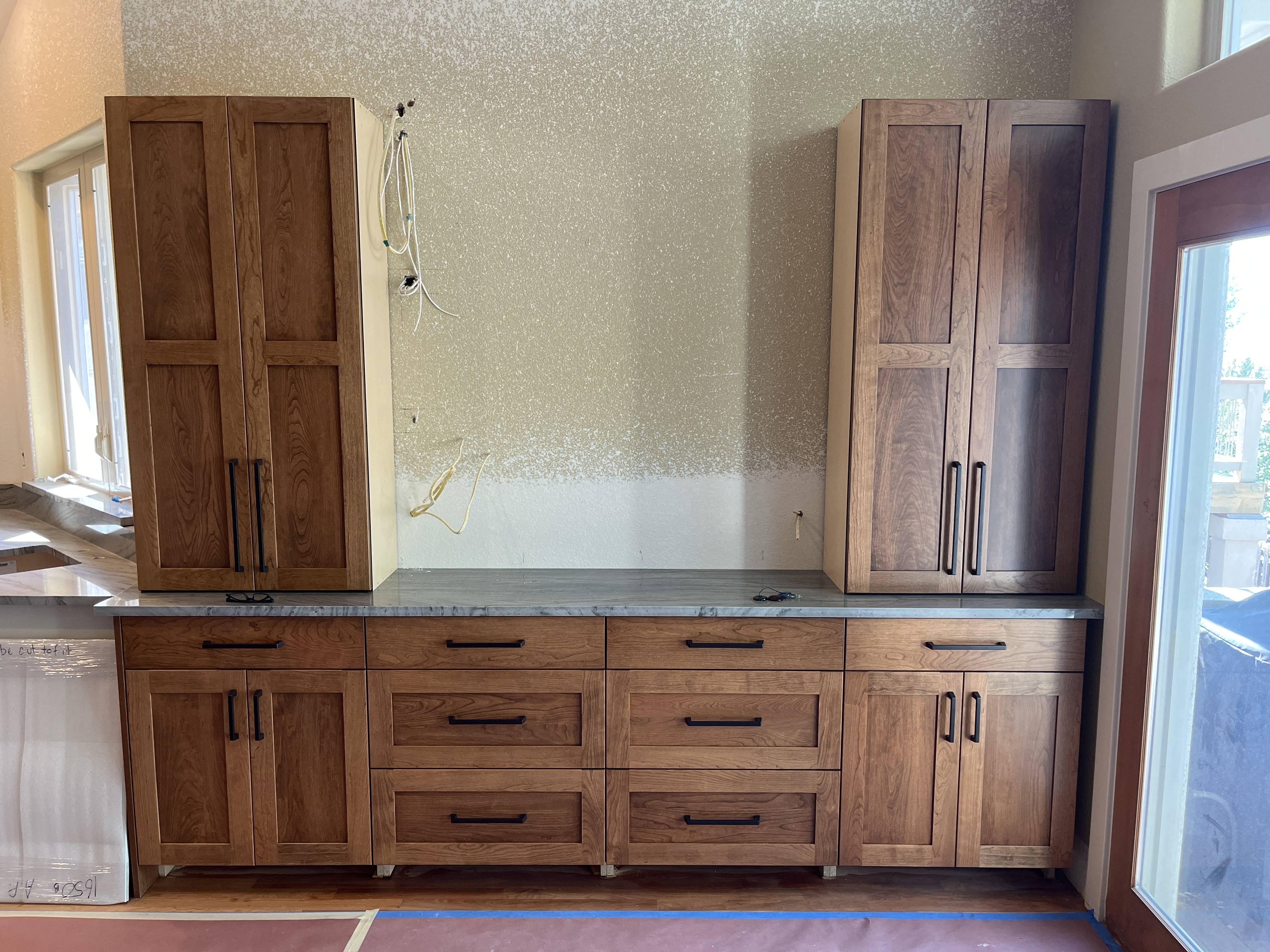 add wood flooring remove constuction debris on the left side add lighting fixture add art in between cabinets add toe kick across the cabinet bottom style area