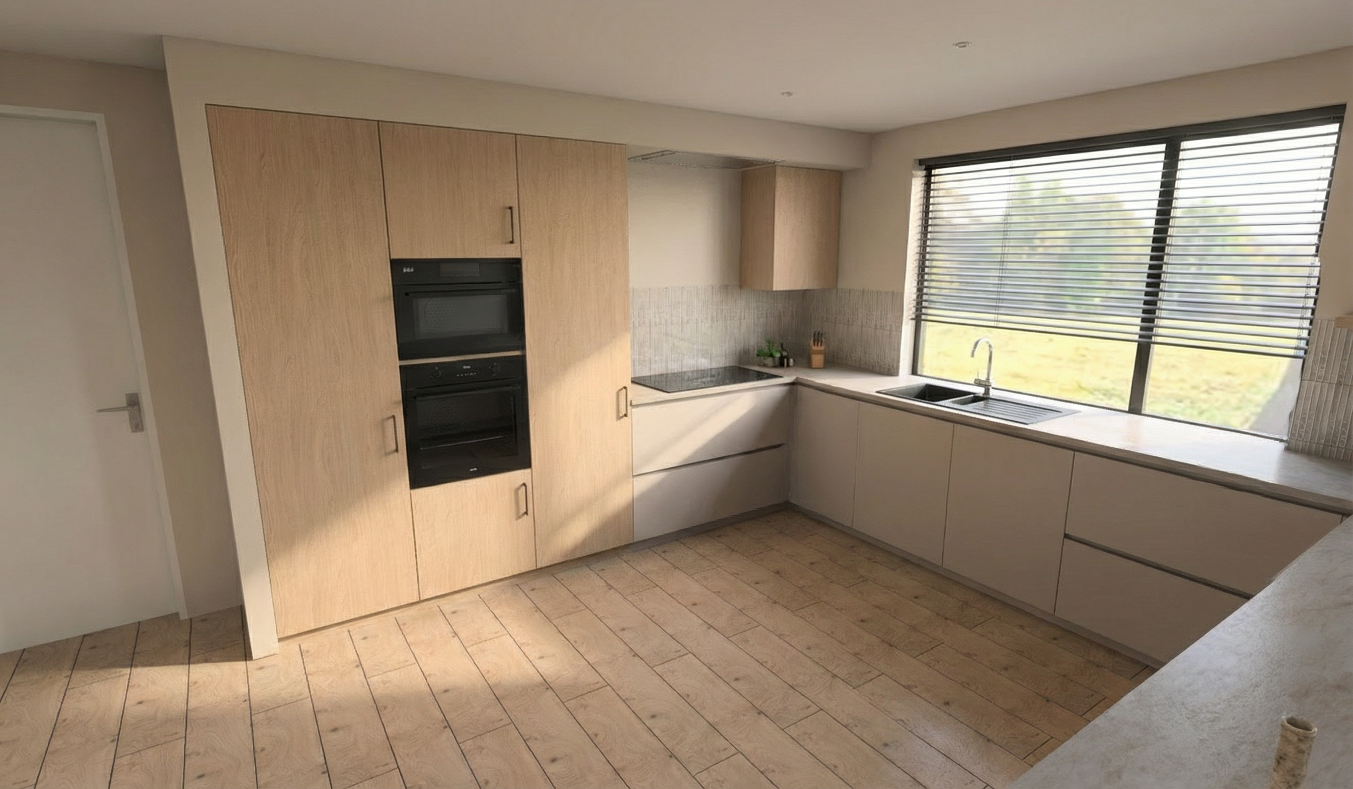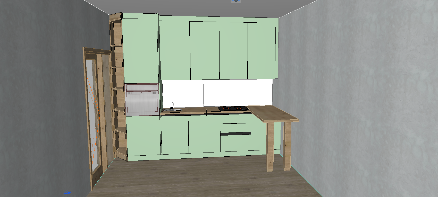 highly realistic kitchen render based exactly on the existing archicad model keep the original design layout proportions dimensions and all architectural details completely unchanged do not add remove or redesign any elements the kitchen cabinet doors should be in a soft light olive green color with a smooth matte finish preserve all cabinet lines handles joints edges and built in elements exactly as they are the worktop can remain exactly as modeled with realistic material texture and subtle reflections make the light olive cabinet color look elegant and natural with soft shadows and balanced tones use realistic daylight coming from the windows combined with soft interior ambient lighting for a warm atmosphere materials such as mdf wood stone metal and glass should have realistic textures and reflections keep all appliances shelves walls flooring and ceiling exactly as in the original model the final result should look like a real high end photographed kitchen with realistic lighting depth shadows and premium material quality without changing the existing design in any way