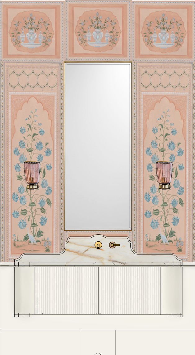 interior shot maintain all of the details of this elevation and show the full extents the wood wainscoting is a high gloss off white paint with dimension there is no natural light only light from the ceiling the lighting is diffused make it photorealistic and glamorous