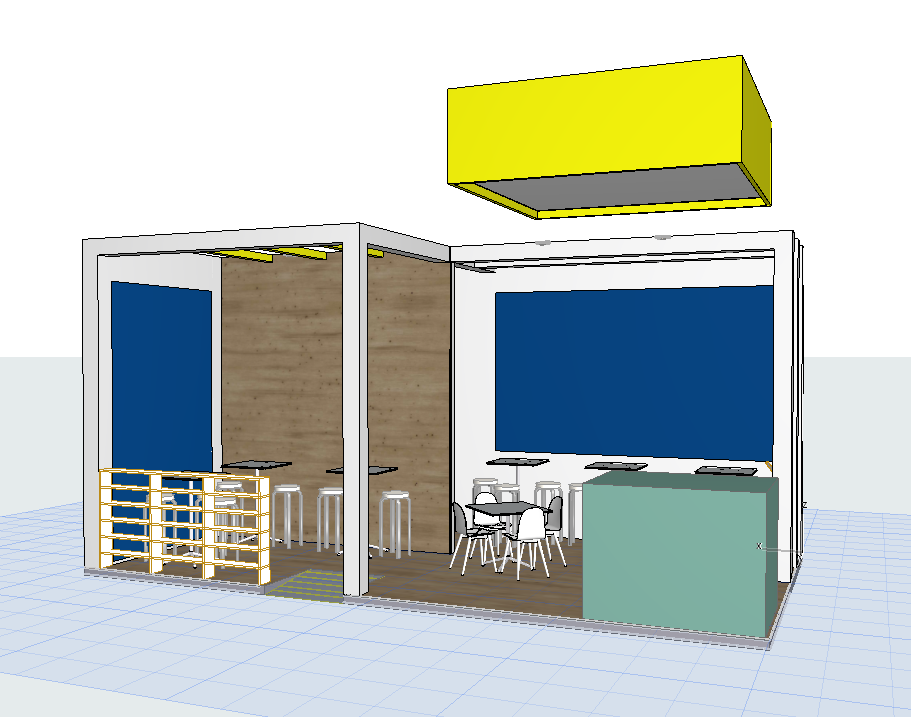 gentilmente posizionami lo stand dentro a un padiglione di una fiera aggiungi delle persone il volume che vedi di colore verde sull angolo dello stand verso l esterno trasformamelo in una vetrina refrigerata con dentro formaggi l esterno della vetrina rivestimelo in legno lo stand ha due lati chiusi dove vedi il blu aggiungimi delle grafiche retroilluminate con sfondi di montagna e formaggio