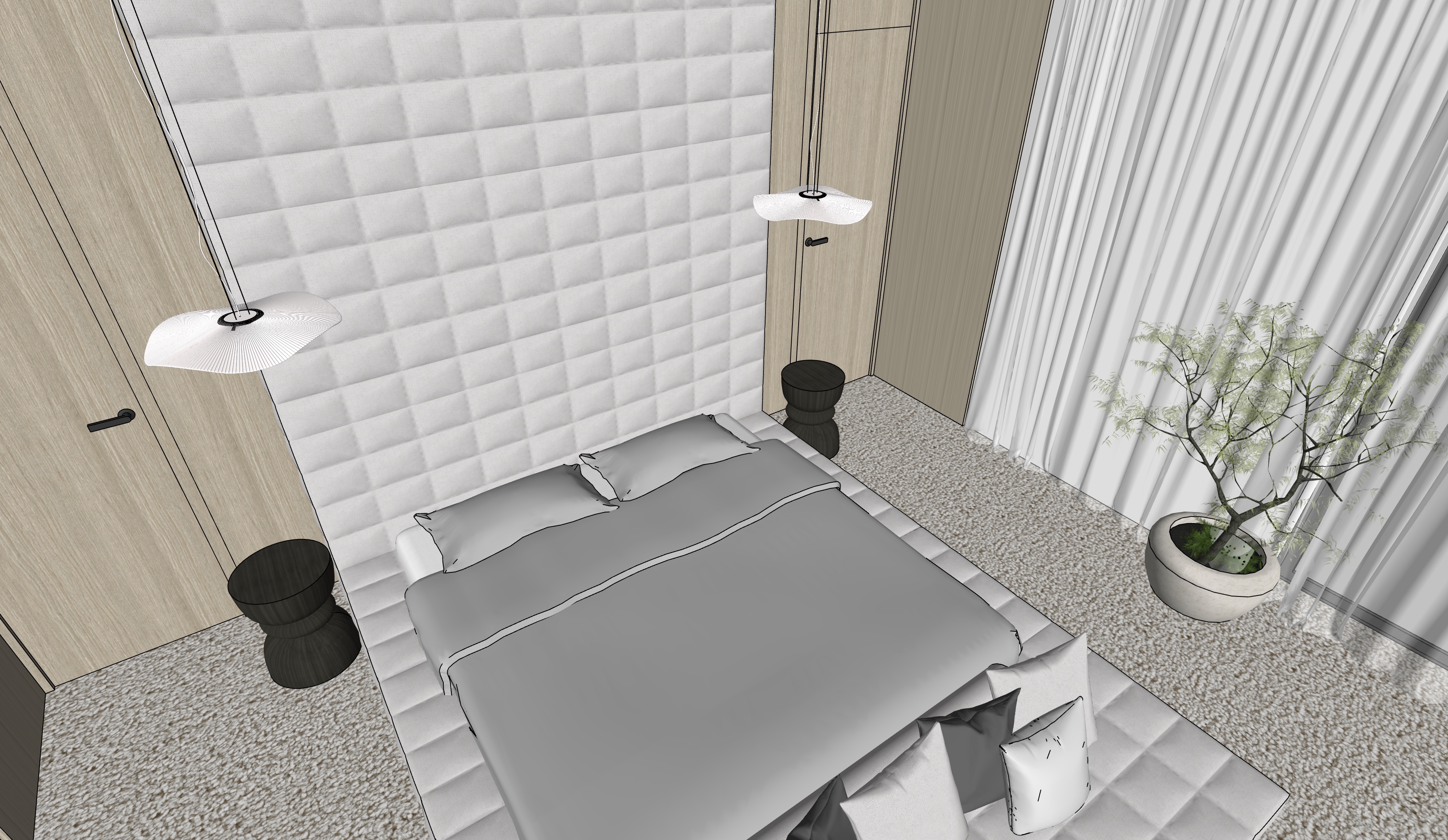 make it winter afternoon in japan turn on the lights haninging from both sides od the bed every suraface is mate add a white siberian cat walking blurred out