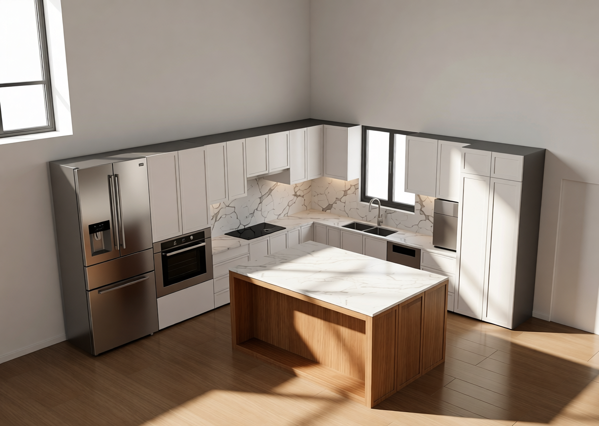 lets add small satin nickel hardware to all the cabinets and add a hood over the range