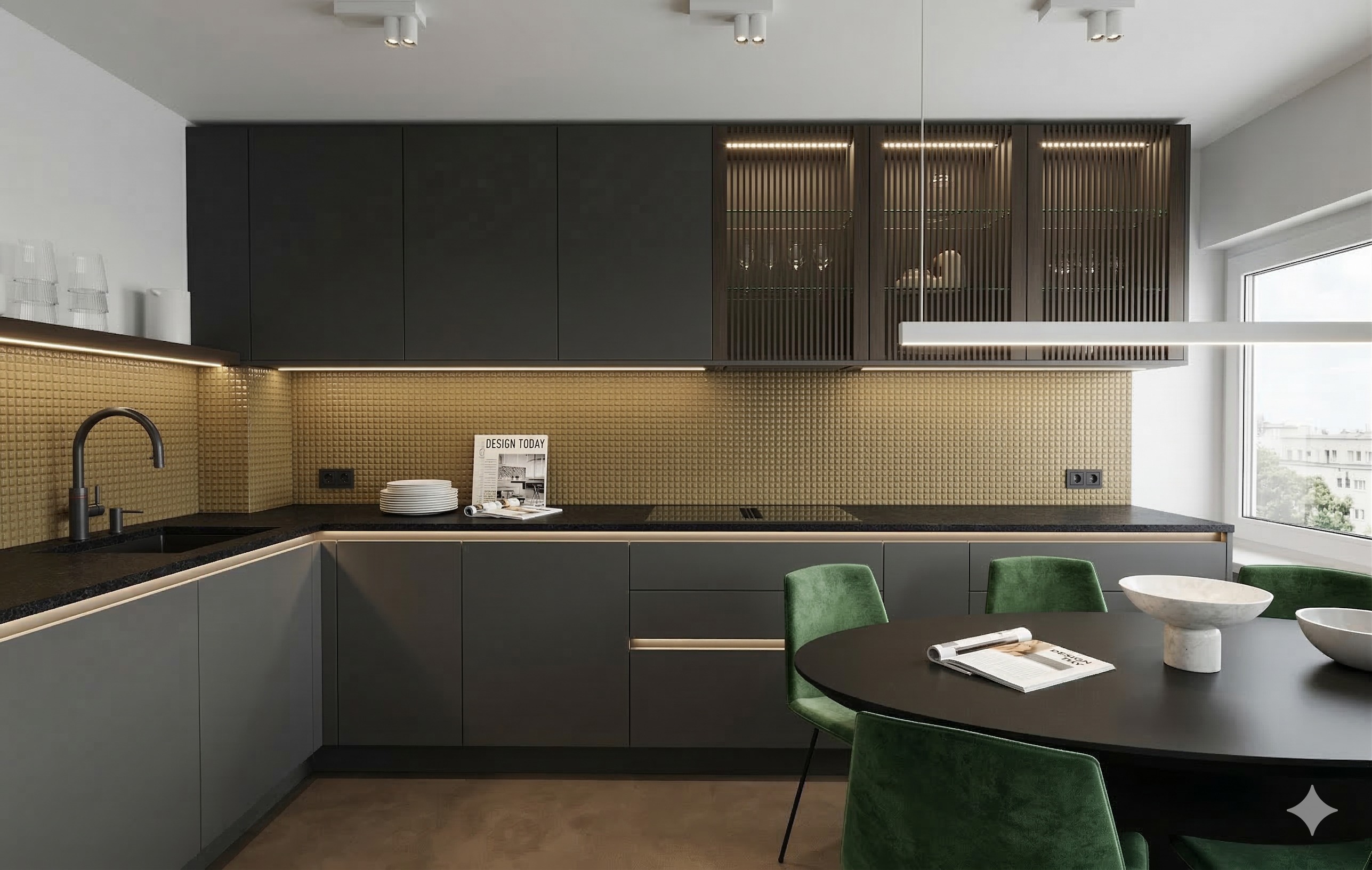 no agregar absolutamente nada mas 1 retira el periodico de la encimera de atras a lado de los platos 2 la luz de los cabinetes altos de cristal es cuadrada no lineal