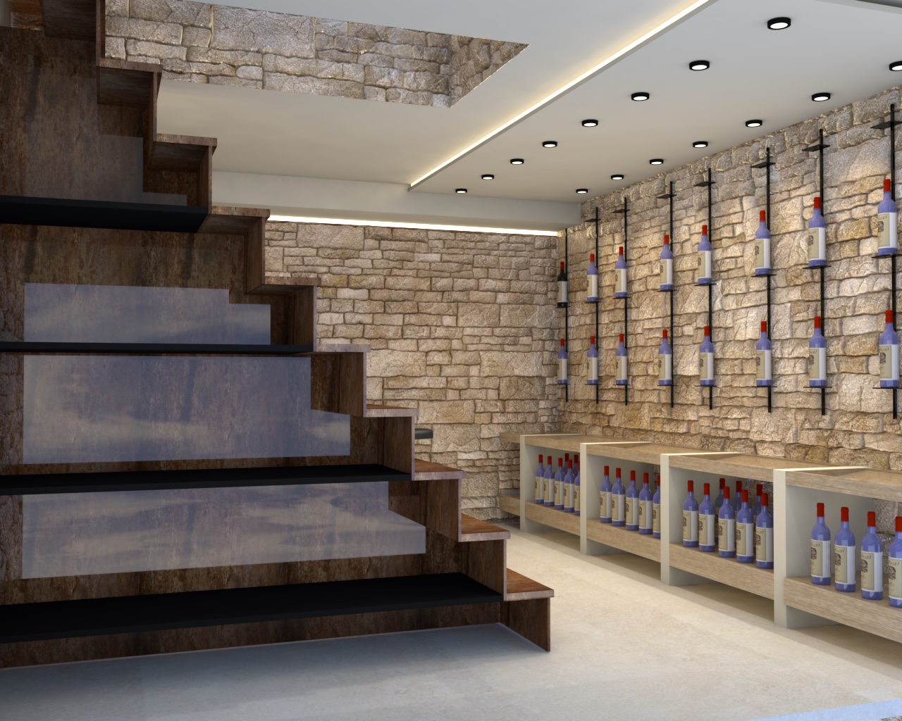 escalier en acier rouill avec des bouteilles de vin noir