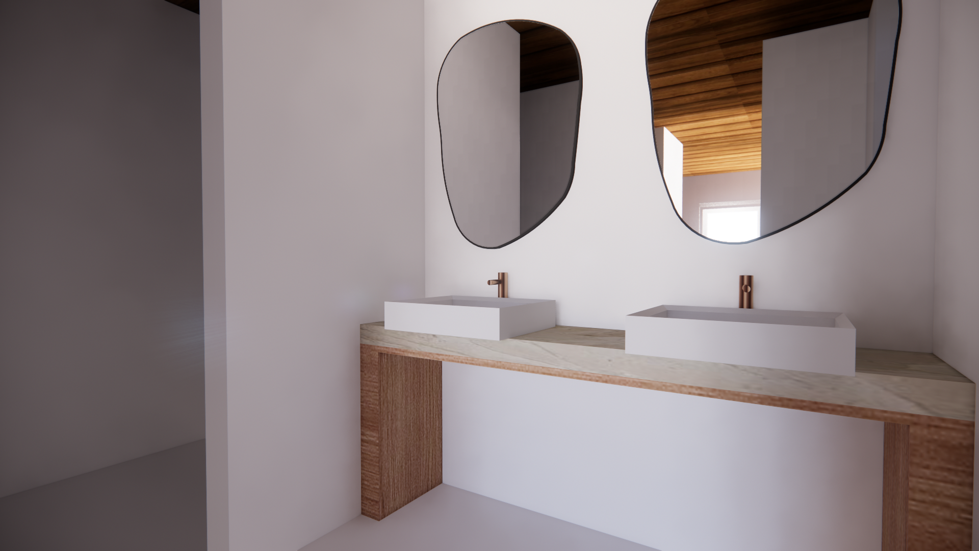 please make this render of a vanity into a asian inspired boho eclectic bathroom see references