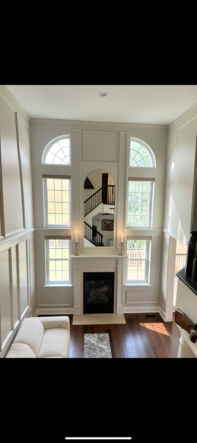 remove decor from walls add paneling lower fireplace restoration hardware remove lights remove boxes remove mirror