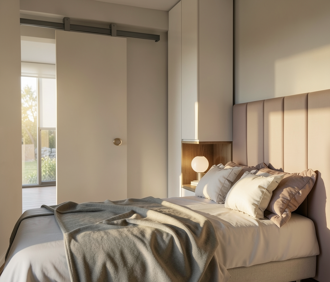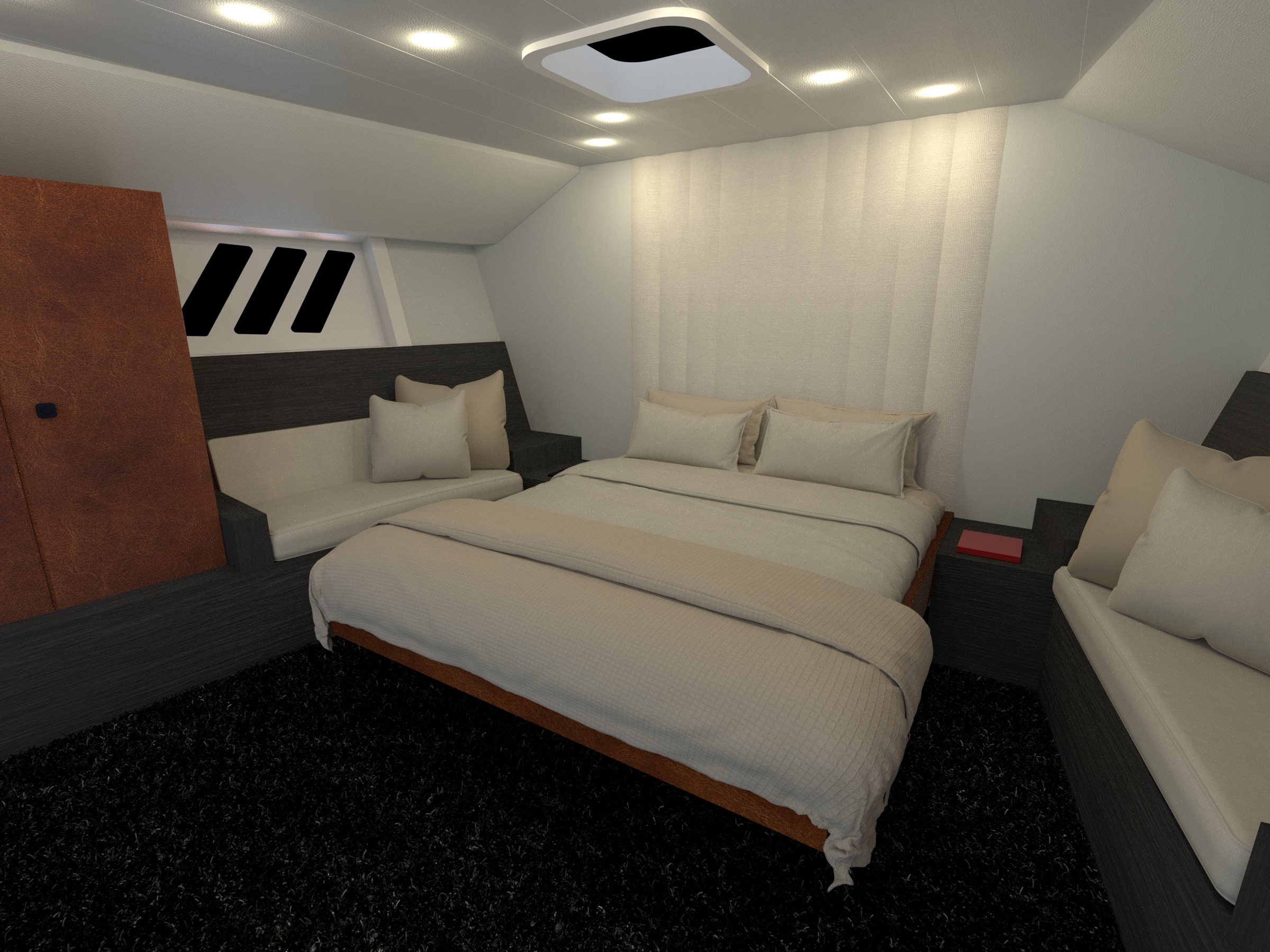 cabina di uno yacht con testiera ondulata in lino soffitto e pareti in pelle bianca armadio e struttura letto in cuoio italiano caldo cuscini e divanetti anch essi in lino atmosfera elegante e confortevole