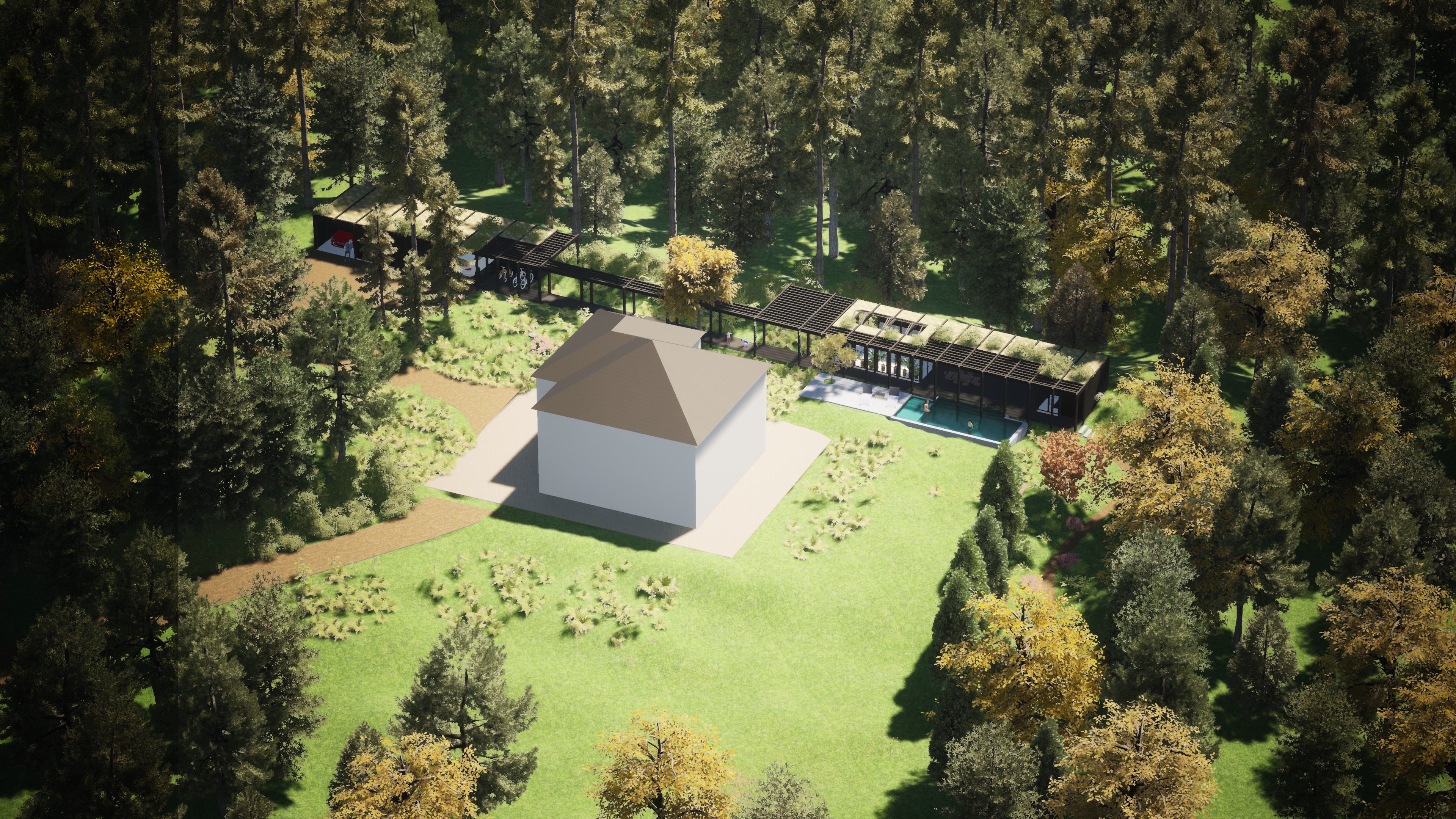 make photo realistic with real trees and grass main house keep as is poolhouse made of iroko wood